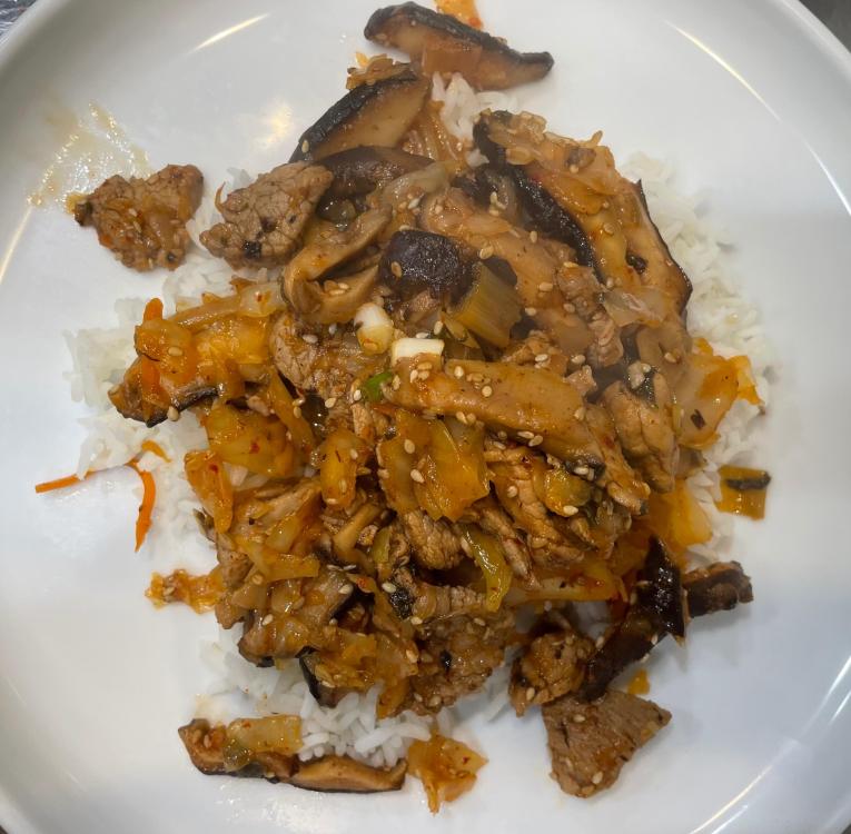 Sesame Stir-Fried Kimchi Pork based on a Milk Street recipe - stir-fry with pork tenderloin, kimchi, shiitake, scallions, garlic, toasted sesame seeds, soy sauce, mirin and toasted sesame oil. Served over rice