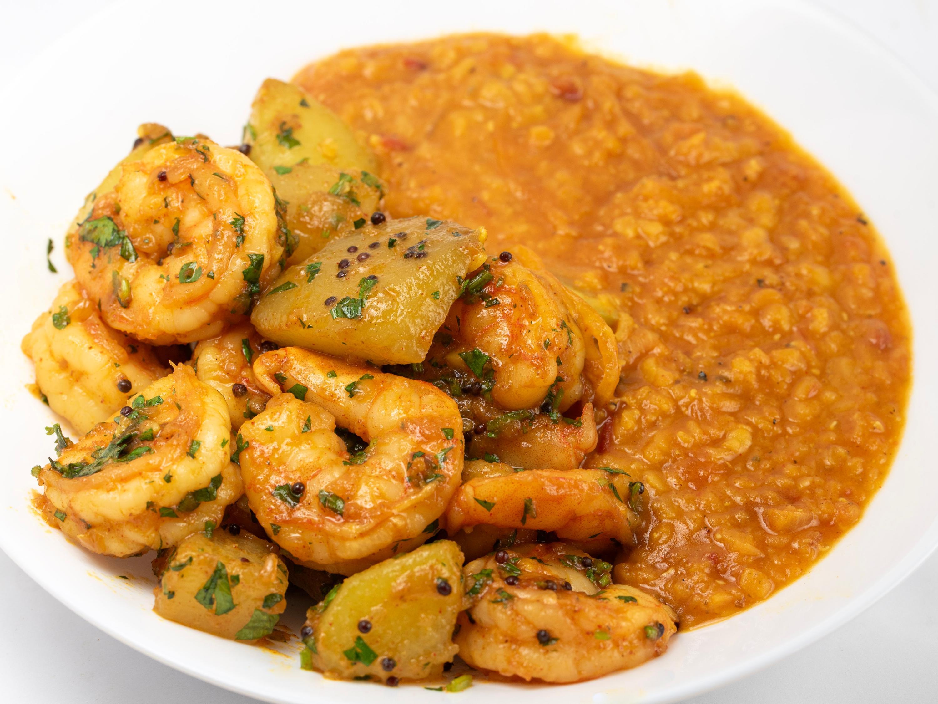 Shrimp curry with chayote: Brown fry onion, then add garlic and black mustard seed. When the mustard seeds pop, mix in chayote, turmeric, and water and cover. When chayote is nearly tender mix in shrimp, bay leaves (sub for curry leaves) and cayenne. Finish with chopped cilantro. Recipe called for asafoetida but I reverse-engineered it with onion and garlic. 🙄 Basadi dal: Simmer red lentils (masoor dal) with water until soft. Fry thinly-sliced onion until translucent, stir in panch foran, then fry with crushed tomato, cumin, paprika, cayenne, and turmeric. Mix with lentils and enjoy. My favorite lentils recipe, very easy and very tasty.