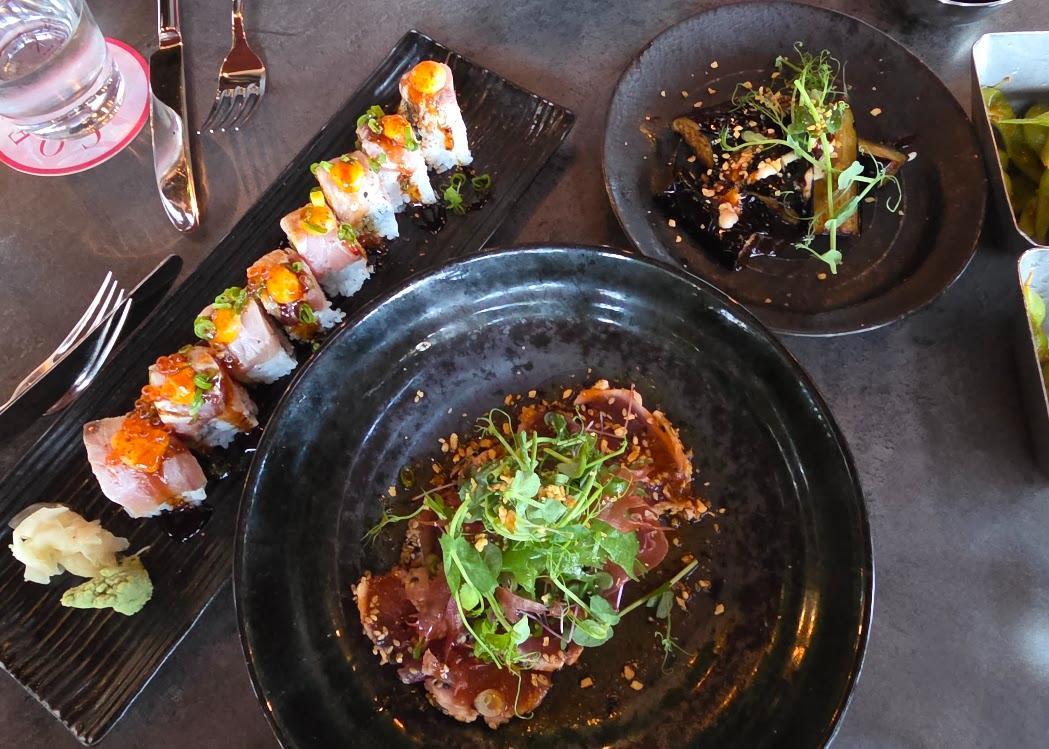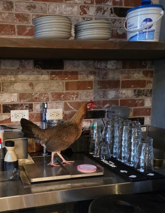 Our last night in Kailua HI (Oahu) we returned to Roy Yamaguchi's newer eatery, Goen Dining and Bar. We liked the atmosphere, food and service, a younger hipper crowd with decent live (but mellow) Hawaiian music. We shared 4 items; Ahi Tataki, Roasted Eggplant (why can't ALL eggplant be cooked to silk in every restaurant?); Hamachi roll. And for dessert, a Basque cheesecake. Free table treat was a well-spiced bowl of cold edamame. The free entertainment was a rooster who would not stop bolting in from the sidewalk. The staff said that they let chickens/roosters walk thru their place, as do all HI eateries where the fowl show up, however this rooster was simply a bundle of chaos. He insisted on roosting on a service area, which the staff had to clear and disinfect and leave empty the rest of the evening, as well as the large table and chairs across from us. The staff (in good humor) had to go thru this drill literally every 5 minutes for the entire hour we were there. All they could do to try to discourage it was spray it with water, which did not in any way deter it. While he was an interesting dining companion his table manners were abhorant.....it was if he was raised in a barn.