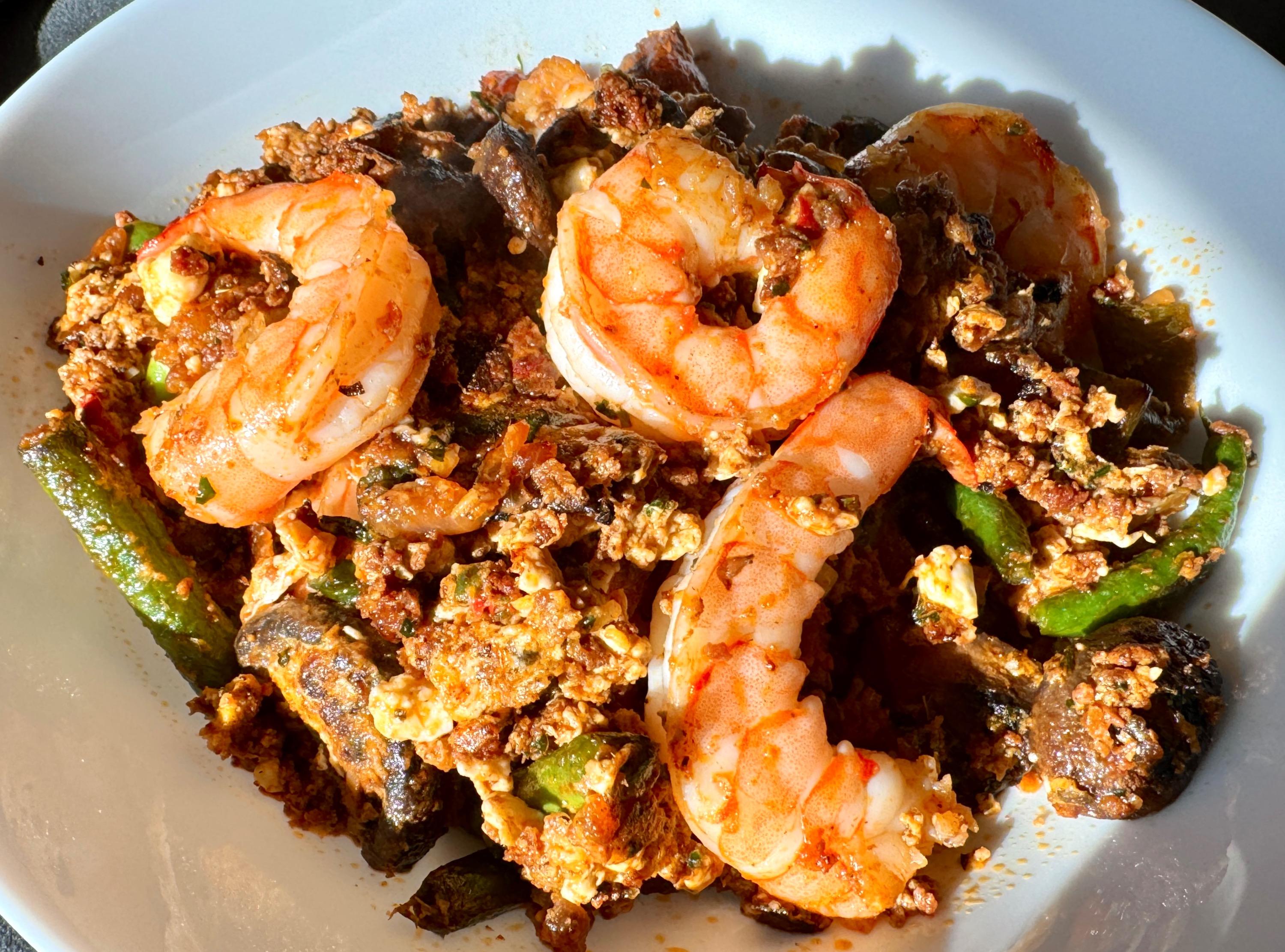 I just checked on shipping frozen gumbo to Canada, but it appears that mixed ingredient foods are not allowed. 🤨 Gumbo is to Cajuns what pho is to the Vietnamese, or chicken soup is to the Jewish community. Soul soothing and comforting. With rice is best, of course: But sans rice, and with deviled eggs subbing for potato salad… also delicious. Seafood gumbo is pricey these days, but it is truly my favorite. I would LOVE to make it for Christmas Eve, but son and DIL wouldn’t eat any, and my husband would be good for one bowl and then done. Sigh. Not sure why I keep so many pics of gumbo on my computer, haha! Shrimp and okra gumbo.