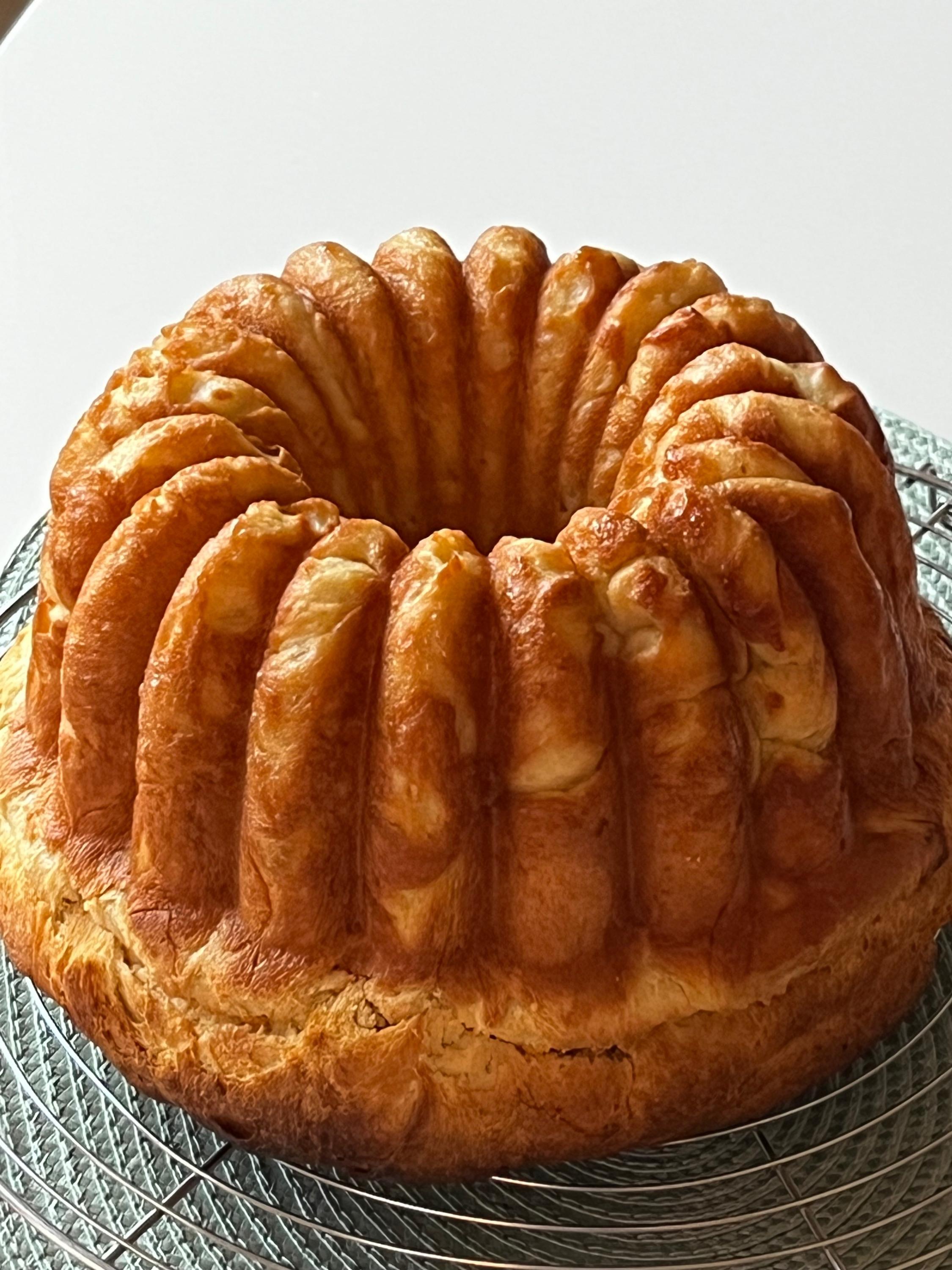 A very grandiose version of Baba-Savarin. A departure from my usual recipe, this is made in a 10 cup Bundt pan, it rose about 2” over the edge of the mold while baking. It as yet has not had its rum bath or apricot glaze , this is for Xmas eve. I plan on wrapping it well and refrigerating until Tuesday when it will be finished off. This is from the “Gateau” cookbook. -