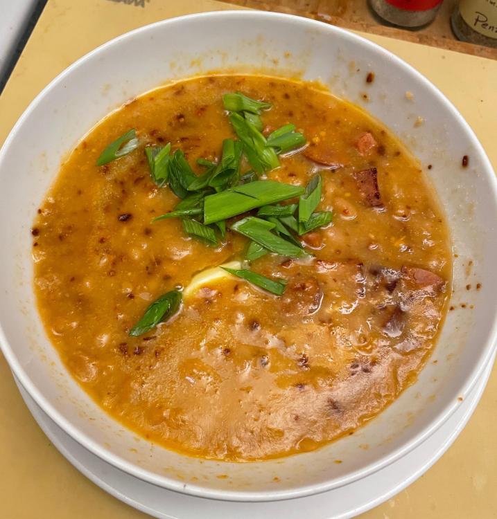 Bean w Bacon soup . Some sauted chorizo ( generic , USA ) knob of butter . window green onions. favorite soup . found they carry lower salt version , and its on sale this week !