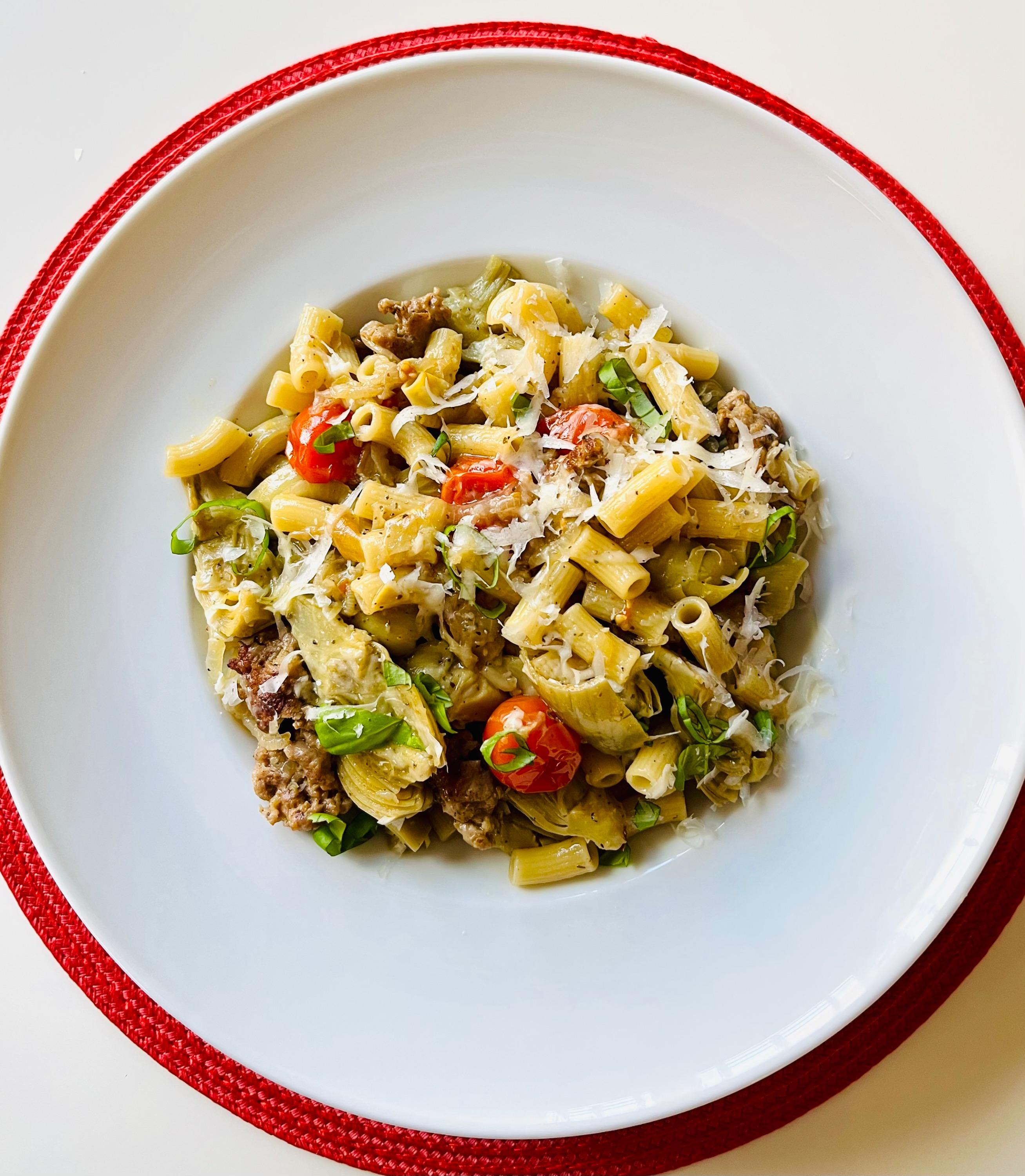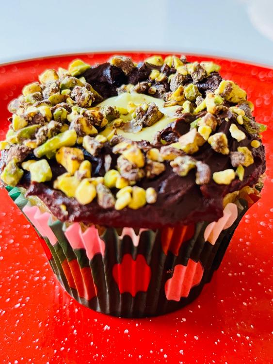 Maccheroni with sautéed artichoke hearts, onions, garlic, sausage, spicy Italian seasonings, tomato and basil. Cooked in homemade chicken broth, sprinkled with Pecorino Romano, a very tasty combination. Pistachio cupcake, core filled with pistachio pastry cream, topped with chocolate frosting and chocolate/pistachio bits.