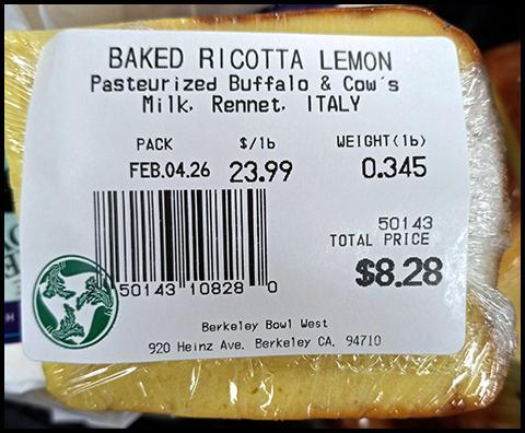This moning, while at the Berkeley Bowl Market looking for some pasta-specific items, I came across this wondeful treat in the cheese fridge. I've had it before - it's not always available - and it's delicious. A baked, lemon-flavored, Italian ricotta cheesecake made with buffalo and cow's milk ... in-effin'-credibley delicious.