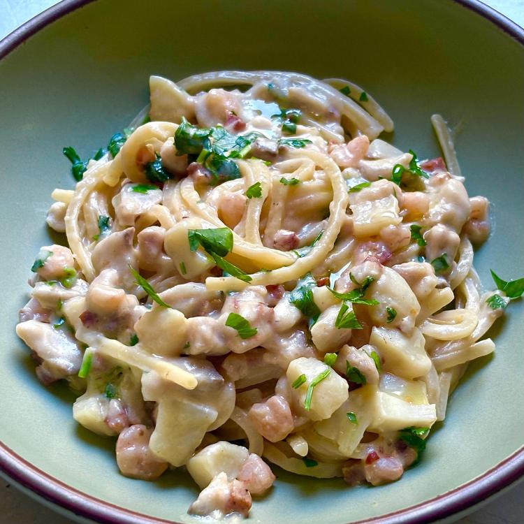 Six Seasons of Pasta has three recipes that use a celery root purée as a base for the sauce. The celery root is peeled, cut into chunks, simmered in milk with bay leaves and blitzed in the blender. I followed his suggestion to freeze the extra purée in meal-sized portions and look forward to using it in different ways. This is the Celery root and seafood "chowder" on p 372 With shrimp, scallops and white fish (I used rockfish), this really does taste like a seafood chowder, though if that’s what I’m craving, I probably want soup, not pasta! I learned from making one of the other celery root recipes to limit the amount of celery root purée to what’s specified. He says a few tablespoons in either direction is fine but too much really gives a gloopy, pasty appearance. The purée has a very light texture and is not pasty at all but too much and it really looks that way. I used spaghetti triangoletti as the pasta. The lemon juice and the drizzle of lemon agrumato oil added the perfect finish.
