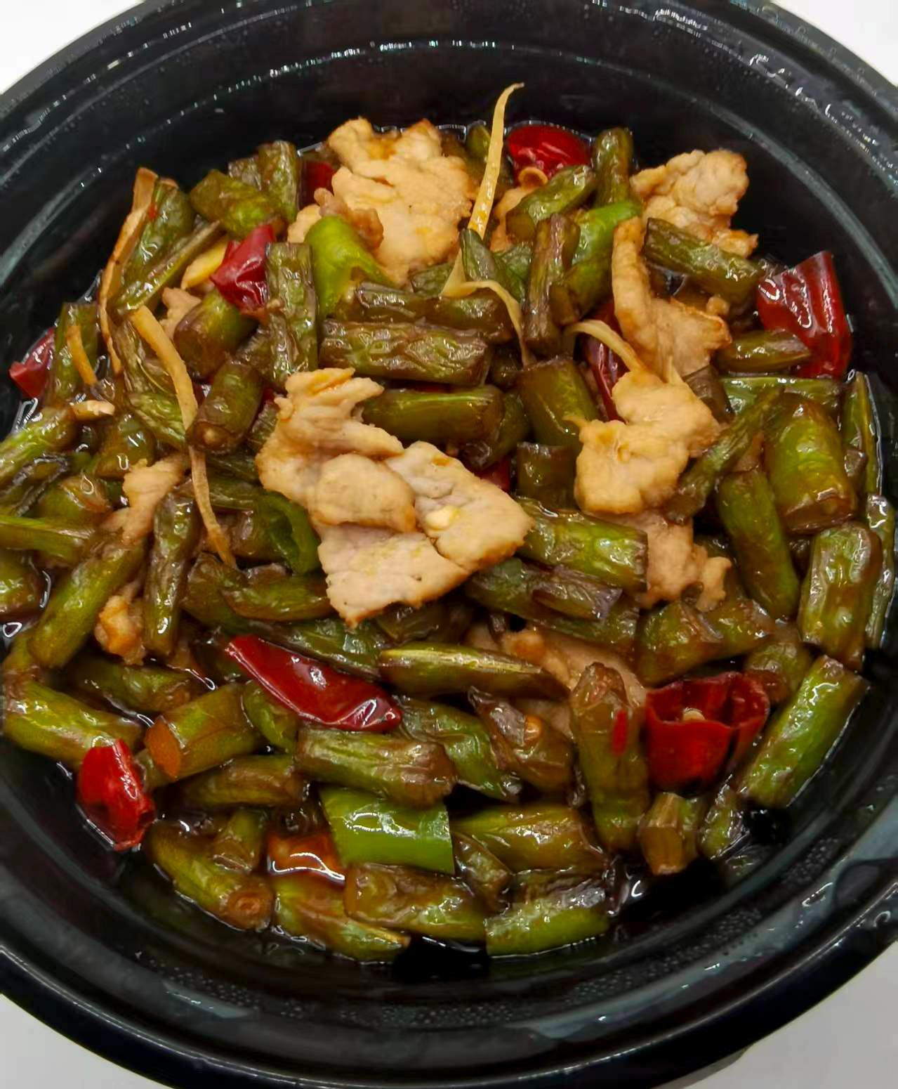四季豆炒土猪肉 (sì jì dòu chǎo tǔ zhū ròu), Green bean and organic pork with red and green space chillies chillies. Served with rice.