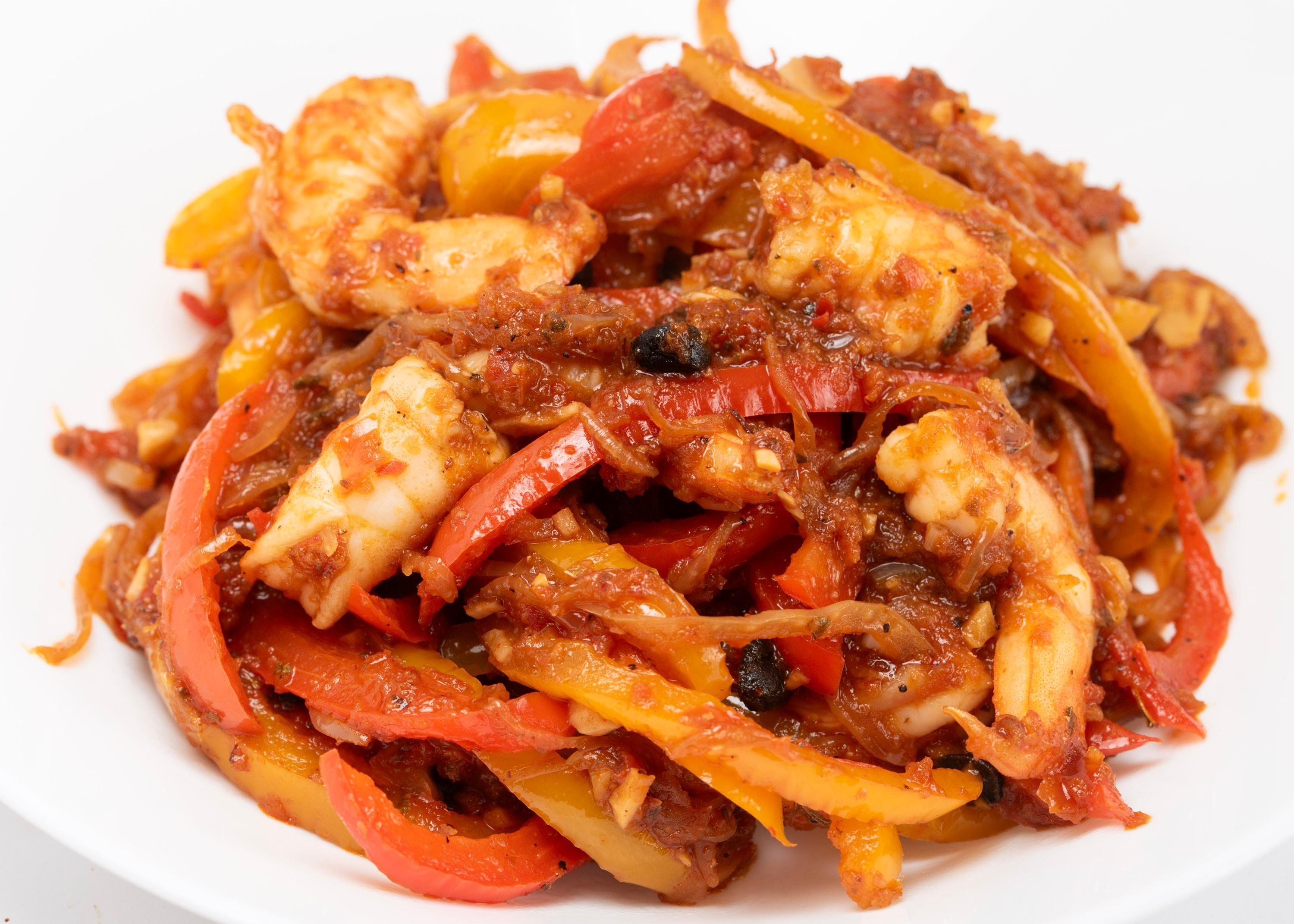 Another "make a virtue of necessity" meal after returning home. Made a spice paste of toasted shrimp paste, Thai chiles, garlic, red curry paste, and red bell pepper in the Preethi. Seared shrimp and removed. Seared sliced red and yellow bell peppers and removed. Sauteed sliced onions and minced garlic, fried the spice paste, added fermented black beans, and adjusted seasonings with fish sauce, lime juice, cayenne, and brown sugar. Mix everything together and finish with Mexican oregano. Spicy and complex, so it didn't matter that there were only a few shrimp left in the bag.