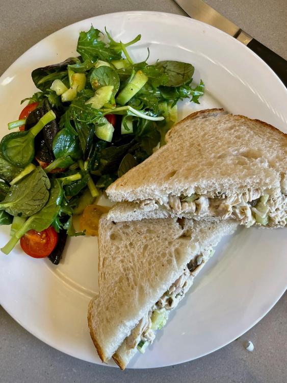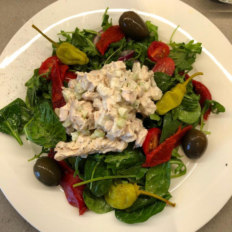 Walk into any deli in NYC and ask for a chicken salad sandwich, and what you're getting is chicken (either diced, minced, shredded) mixed with mayo, minced onion, minced celery, maybe some parsley, maybe a little acid, on whatever you've asked for it on (e.g.: rye, Kaiser roll, white bread, wheat bread, etc.). Personally, I like to add mustard and either lemon juice or red or white wine vinegar to my chicken salad. Mise: Chicken salad sandwich: Chicken salad on salad: When you start talking about dubious add-ins, such as dried cranberries, raisins, grapes, etc., you've moved to California.