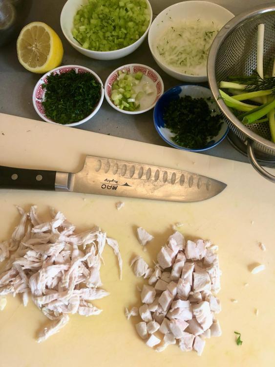 Here you kind of get into a territorial battle over definitions. Where I grew up in the Midwest, any meat that was ground or diced and mixed with mayonnaise and various add-ins was called salad. It was used on sandwiches. Examples: chicken salad, tuna salad, ham salad. In some areas, if the meat was ground fine it was called sandwich spread. Examples: ground bologna, ground ham, or ground roast beef. Prime examples in Europe are Wurstsalat and Coronation Chicken. Their primary component is meat not greens. Although I have not seen Coronation Chicken described as salad, only that it can be used as salad. The OP did not specify whether whether she meant for the chicken salad to be used in a sandwich or with greens as a meal. It does make a difference. To me, the example that I posted is not chicken salad. It is a salad with chicken. -