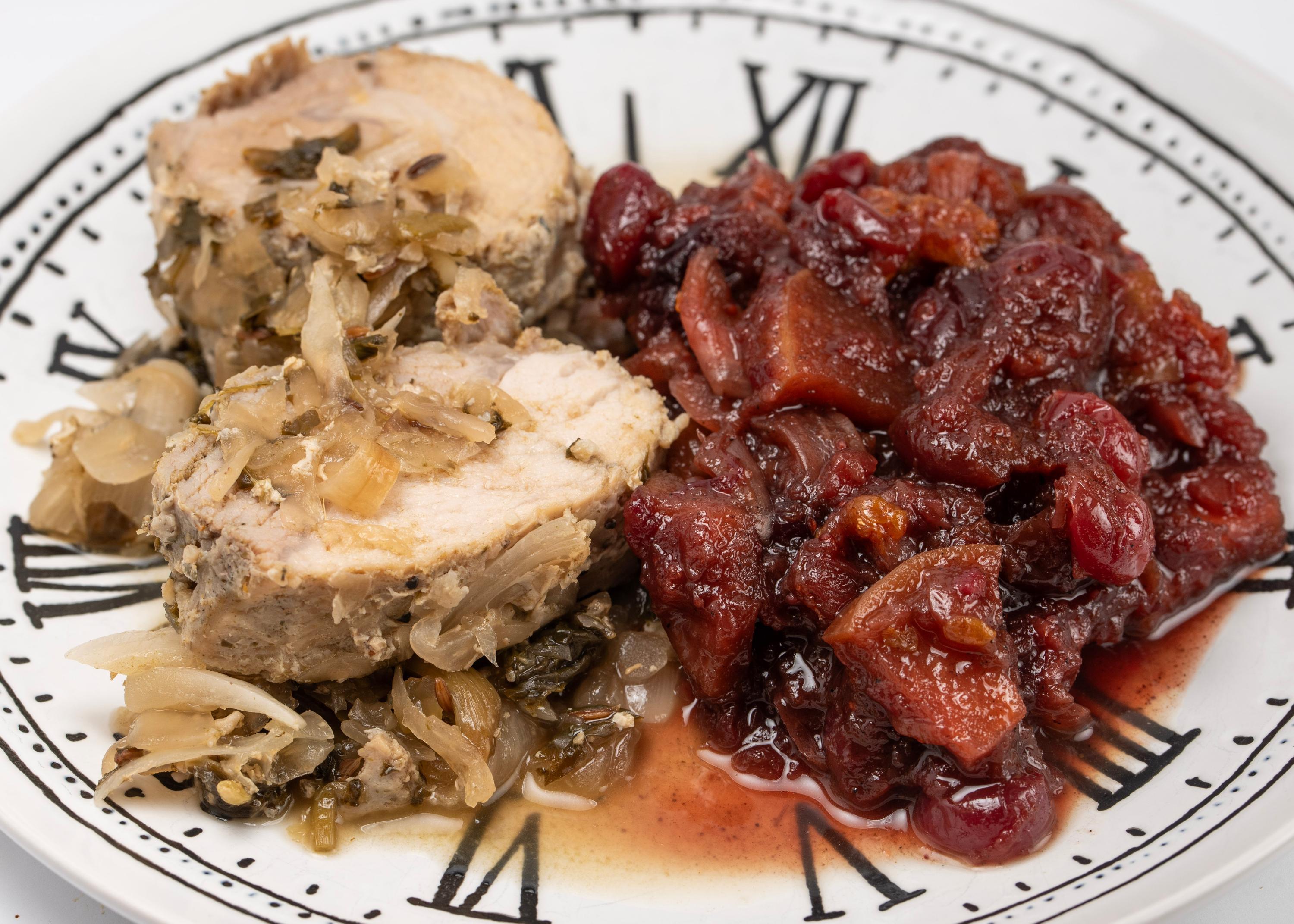 House guest cooked dinner the other night - this was leftovers for breakfast. Pork loin on a bed of onions and home-grown sorrel, and a delicious cranberry chutney with apple and pineapple. The actual dinner also included bulgur wheat, roasted chickpeas, and chopped walnuts.
