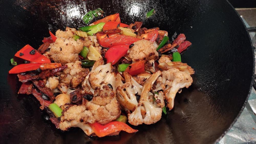 Had some cauliflower left around, so I wok-ed it with smoked bacon, red peppers, green onions, soy sauce, ZheJiang vinegar and fermented black beans. The taste reminded me of HuNan food, but I would not dare call it HuNanese. Bacon was cooked first to release the fat, cauliflower went in second with the black beans, and the rest afterwards.