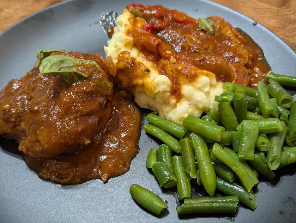 I am probably the crappiest photographer on this forum, but I have cooked and I am sharing. Pressure-cooked curry base (onions-garlic-tomato purree, ground: corriander seed+jeera seed+chilies+couple of fenugreek seeds, kasoori methi leaves+soy sauce, 25 minutes under pressure), chicken breast and frozen green beans added covered (not pressurized) for 15 minutes, squeeze of lemon, ginger matchsticks at the end. Works perfect when you feel like you want Indian food, but Indian is not in your town.