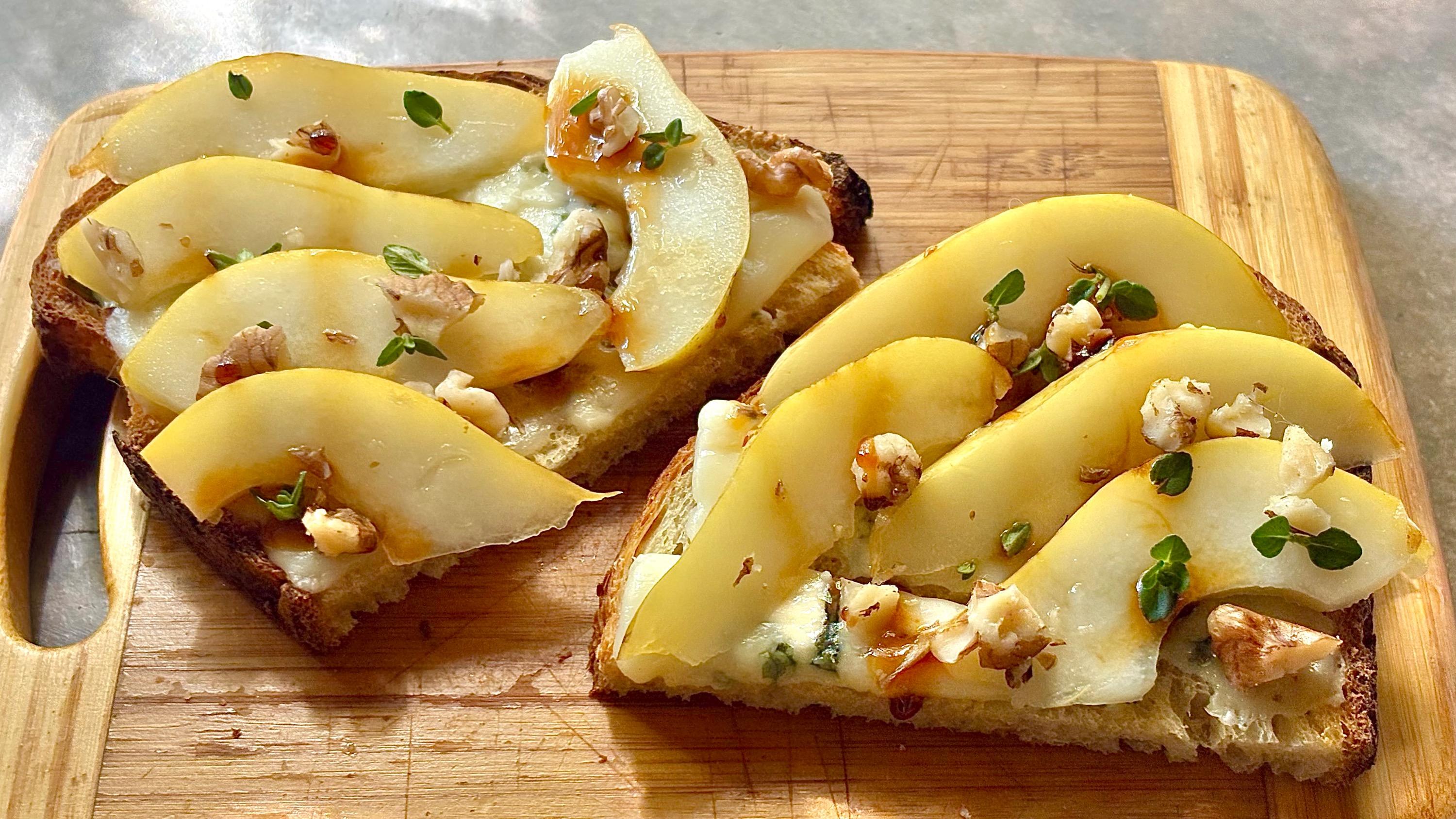 Toast with Gorgonzola and pears with a sprinkle of toasted walnuts, thyme leaves and a drizzle of hot honey I was debating between toasts, like this, or a grilled cheese version. Maybe that will happen another day soon.