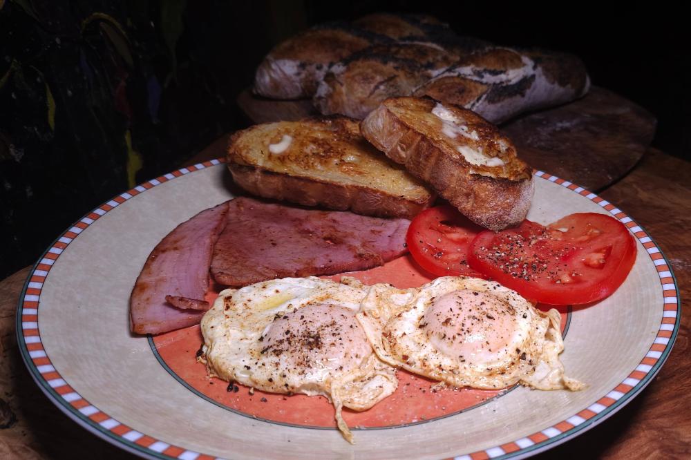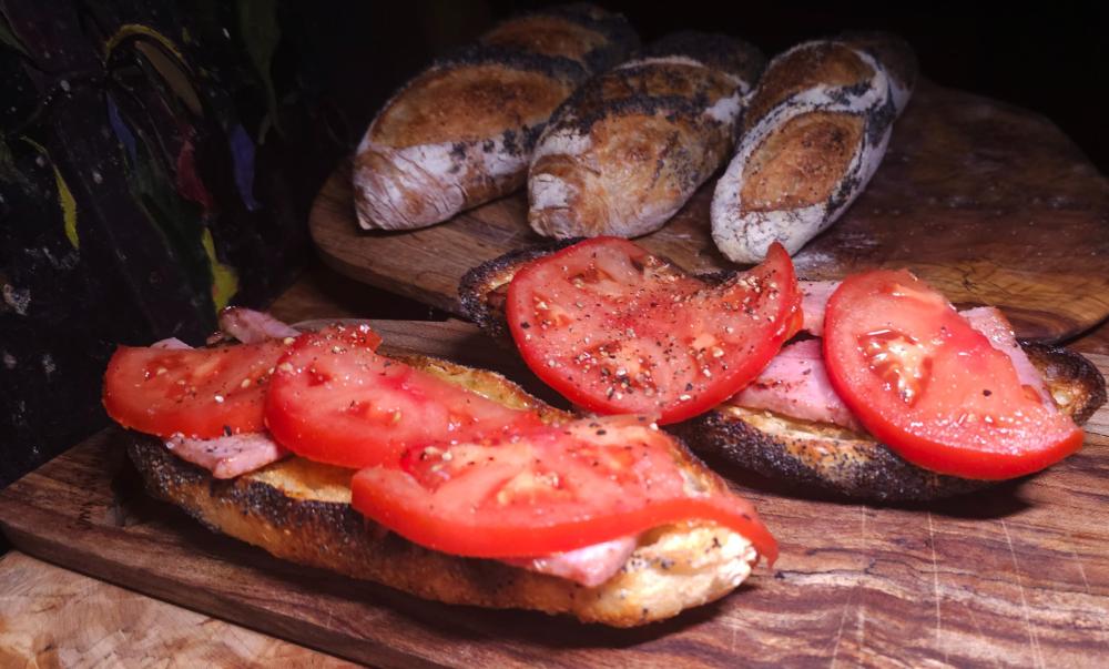 Baked four smaller baguettes with poppy seeds yesterday morning. I normally don't eat breakfast, but I sliced one of the small baguettes horizontally, toasted and topped with fried ham and tomato. Moe had toasted sourdough, with fried ham and buttered basted eggs for his breakfast.