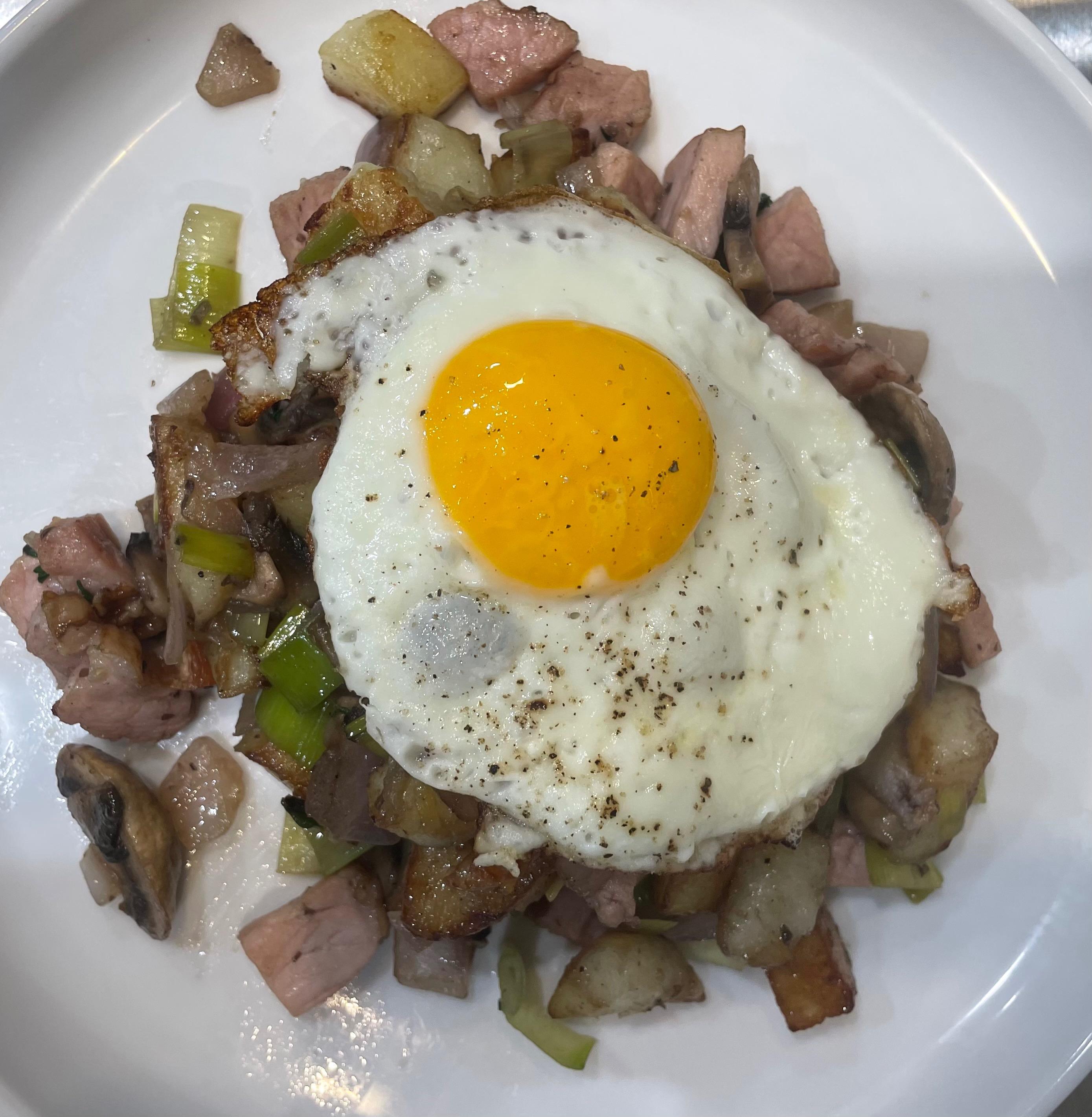 Pyttipanna - Swedish fried potatoes with “small things” - here the fried potatoes are made with kassler, leeks, mushrooms, red onions and thyme. Topped with fried egg