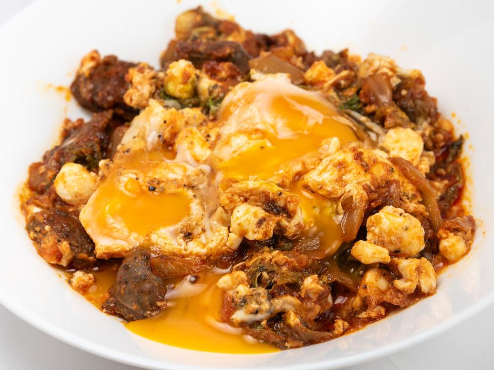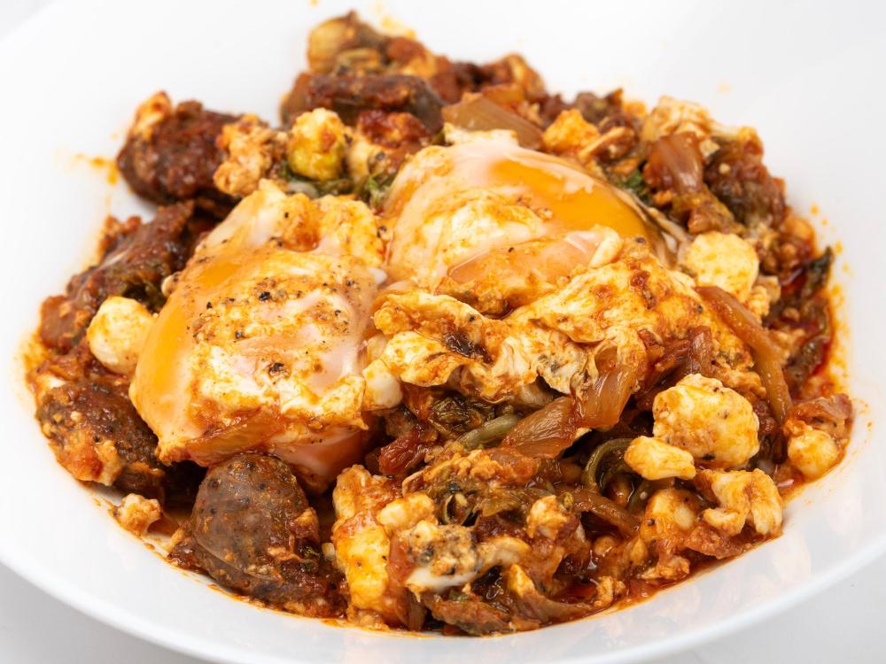 Merguez sausage, sliced Napa cabbage, and "super-spicy" kimchee, flavored with gochujang and doenjang, then finished with feta cheese and over-easy eggs. Sometimes it is nice to start the day with a breakfast that makes your nose run. Yolk contained: Yolk running free: