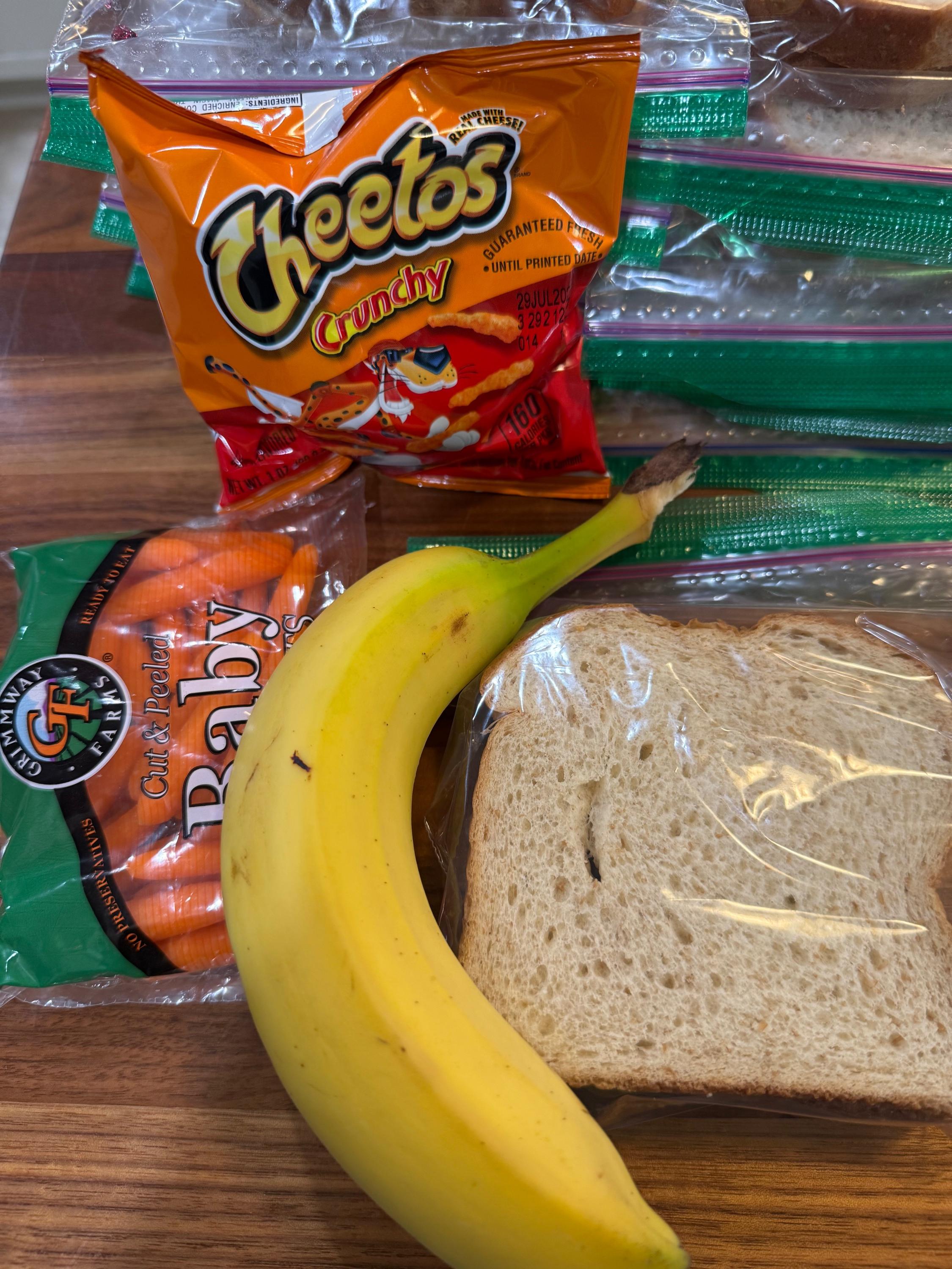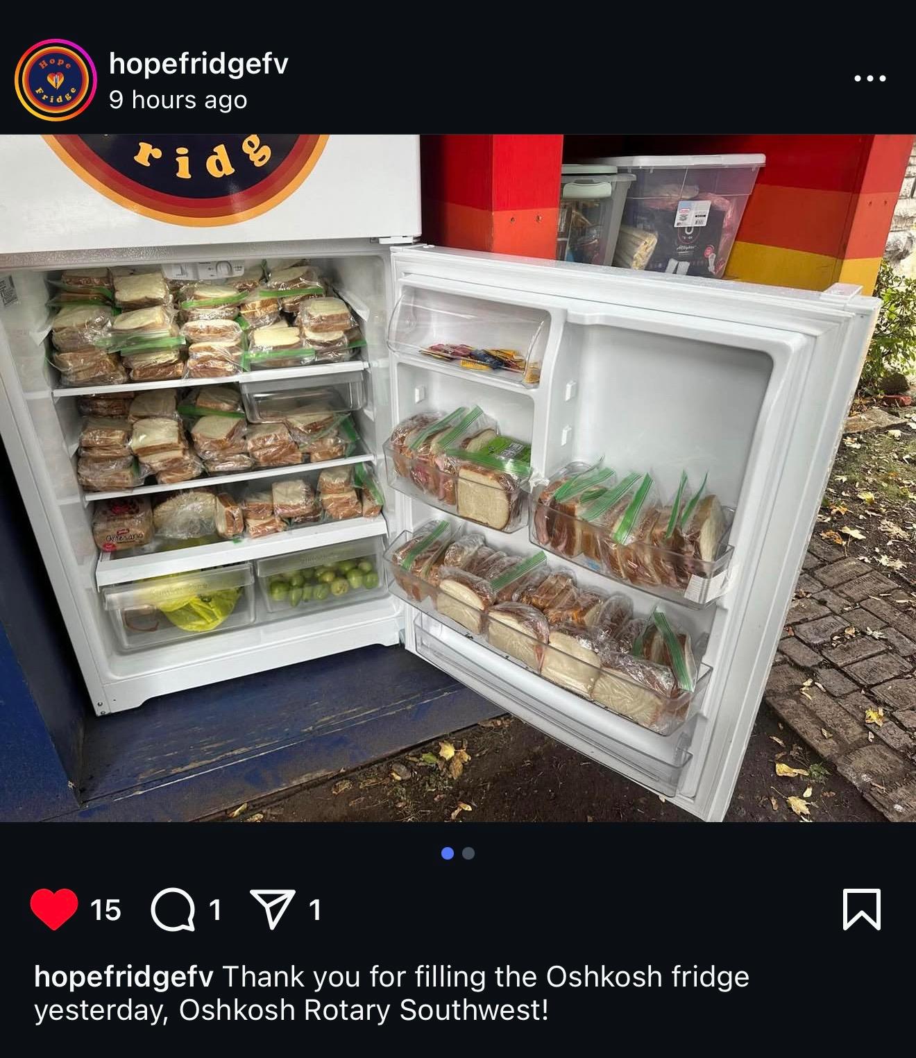 Even though I haven’t decided on this week’s CFM (but have an idea), I think I’ve decided what I’ll do for Thanksgiving week. It would seem obvious that I’d do some kind of Thanksgiving themed meal, like roasting a turkey or baking a ham and making a few traditional sides. But I’m thinking that during Thanksgiving week, school kids will be home and maybe I should make lots and lots of sandwiches, instead. There are numerous places offering free Thanksgiving meals (one place says they are preparing 5,000 meals), so this would be different. Not that I’m trying to be different, just trying to be practical. I’m not sure if I would do them as bag lunches or just packs of sandwiches, but pictured is a bag lunch I’ve done in the past. The sandwich was PB&J, but I could do a variety. Here’s a pic from a community fridge in Oshkosh. Inspiring!