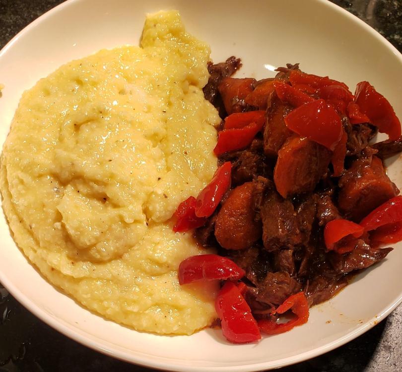 I can't find my original post about this, but I found a vacuum-packed bag in the freezer labeled "Boneless Pork Shoulder, 2 lb 1-1/2 oz" with the notation "131F 3.5 hrs". It, er, also is dated April 2022! But it looked good, except that I maybe detected some frost developing in the bag. Out it came, and into the refrigerator. Today I finished thawing it in another sous vide bath at 131F. It probably got about 2 hours' worth but that was just me doing other chores and figuring it would all come up to temperature. I wish I'd taken a picture of the sealed bag after thawing and before opening. There was 1 to 2 cups' worth of juice. I tasted it, saved some, gave the dog a taste. Maybe I'll use it for gravy, maybe not. I took a slice and made it into a grilled dinner sandwich shown here. The rest of it you can see peeking out from the bag before I rewrapped it and put it into the refrigerator. Why exactly I did this particular work is difficult to tell now. My husband was still alive then, and we had different ideas about how pork roast should be cooked (his was good, but he considered it the One and Only Way whereas I liked to experiment.) We liked pork sandwiches. Maybe that's what I had in mind. Tonight's dinner sandwich is good, but this would also lend itself to a quick reheat with gravy from the drippings. At any rate: 131F for 3.5 hours gave me the exact texture and doneness that I wanted. If I can find my notebook, I'll enter it!