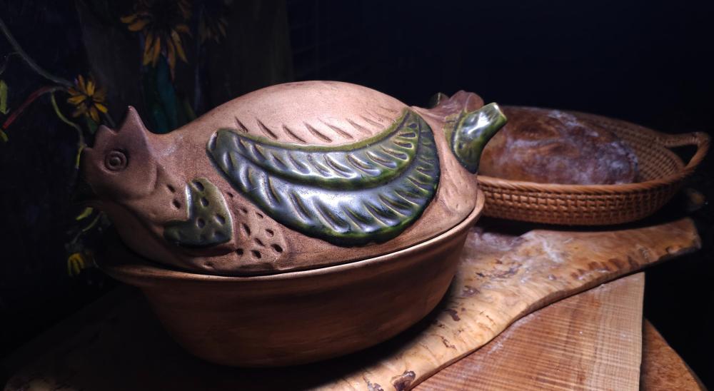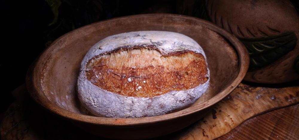 I found this beautiful little vintage clay Chicken roaster on our local FB Marketplace. I was working yesterday and the seller was kind enough to drop it off to me. I had a sourdough in the fridge for three days. Took it out of the fridge at 8:00 last night and shaped it at 4:00AM this morning and baked two boules, both in clay bakers.