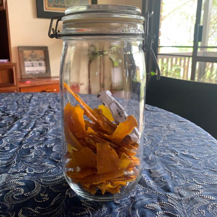 I’m also dealing with an embarrassment of mangoes. This is what 5 dehydrator trays of sliced mango look like.