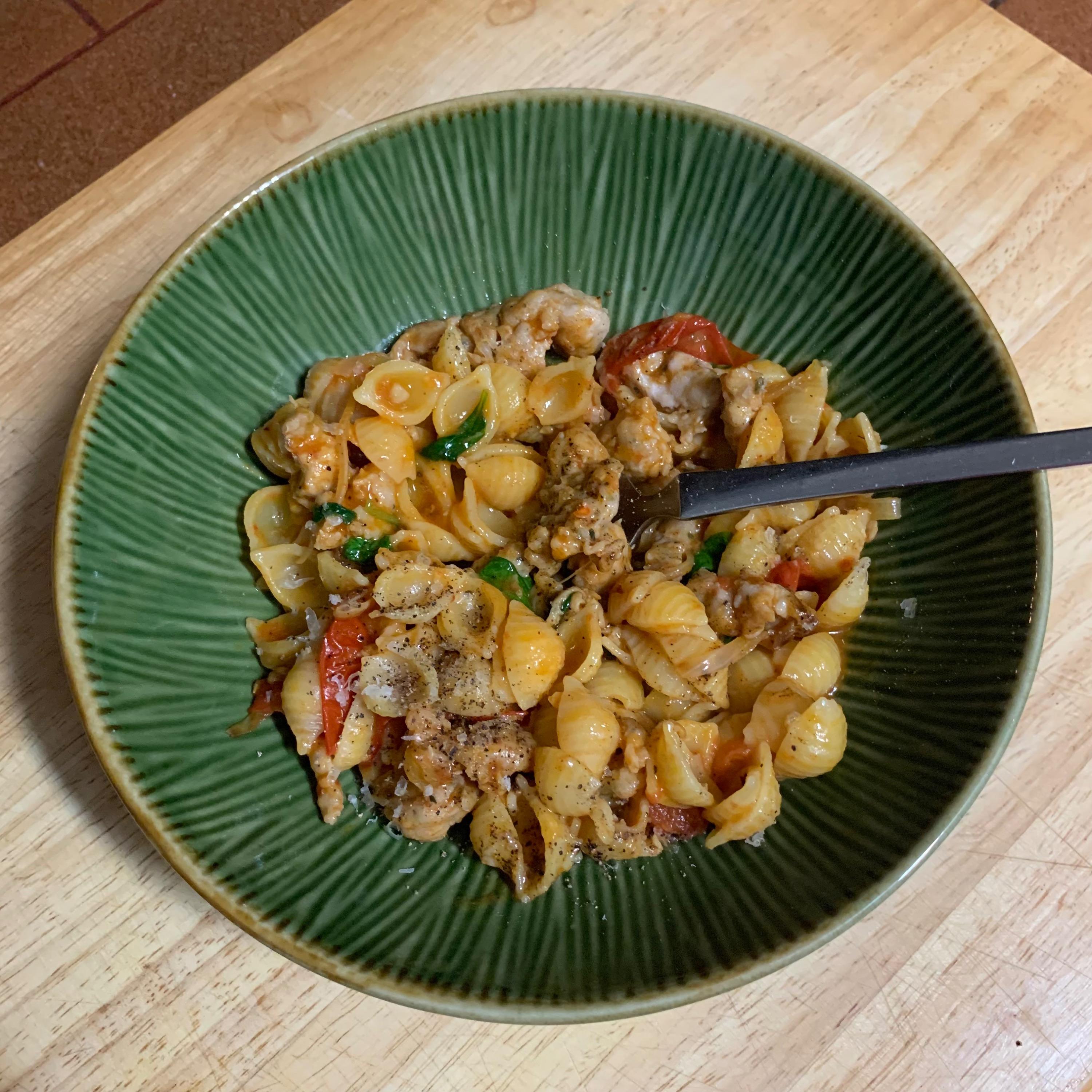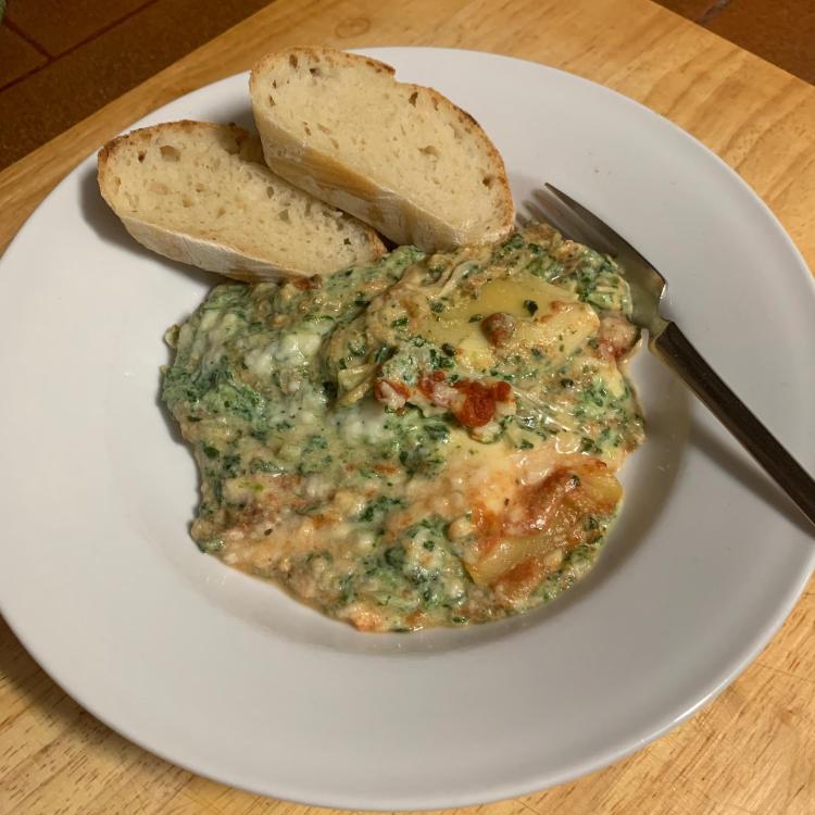 A favourite pasta dish with chicken sausage, anchovies, garlic and sampari tomatoes. Lots of basil and Parmesan to finish. Yesterday I tried my hand at a no knead baguette and I reckon it turned out pretty well. Dinner was a pesto spinach and cheese lasagna from the freezer with said bread.
