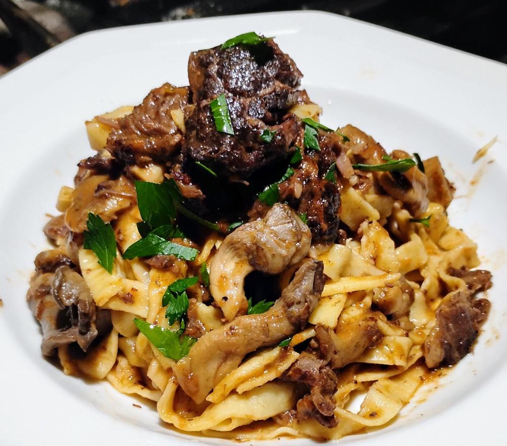Dinner was a variation of Stracotto Di Manzo prepared with beef cheeks and short ribs. I added some sauteed Italian Oyster mushrooms to the sauce and served over fresh tagliatelle pasta that I made with my trusty Atlas pasta machine that I bought in the early 1980's.