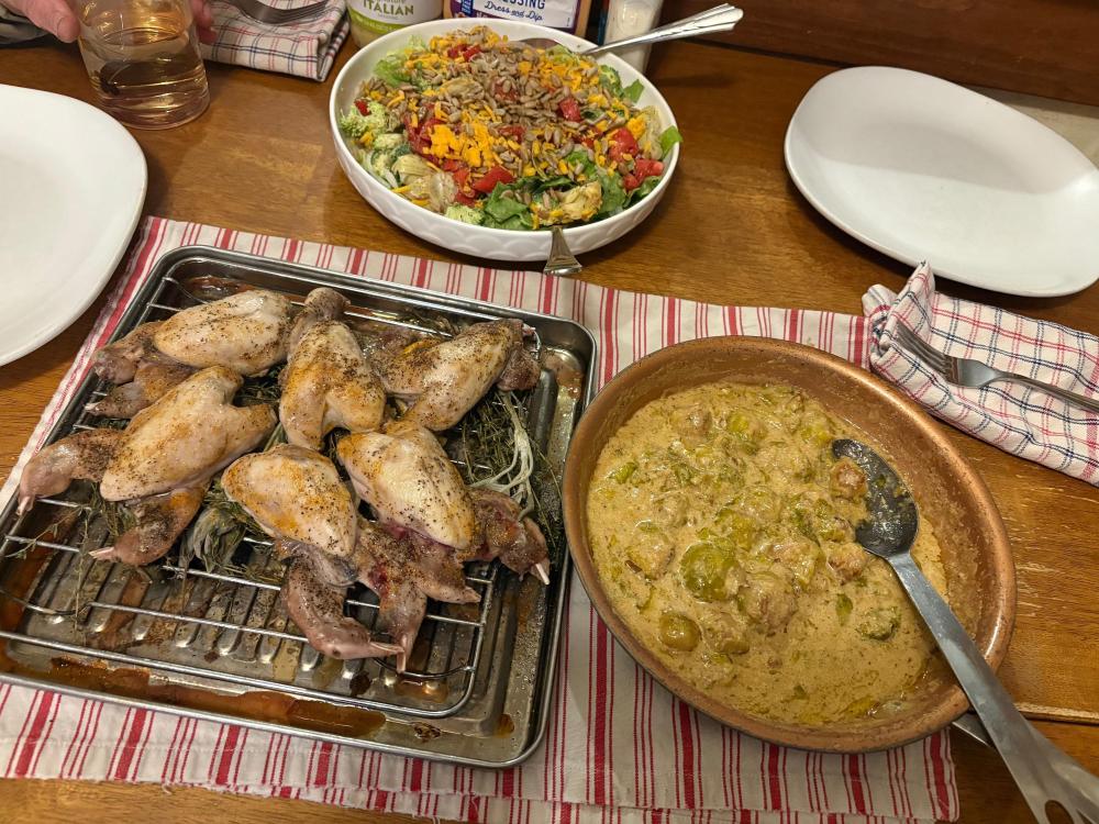 It feels more like spring time around here. I don't need to be wearing shorts and flip flops on Christmas Day sigh lol. Come on cold! Tuna melts in a pepper, fries and deviled eggs Sv'd pork loin, mushroom sauce and roasted asparagus Roasted quail, salad and brussels sprouts