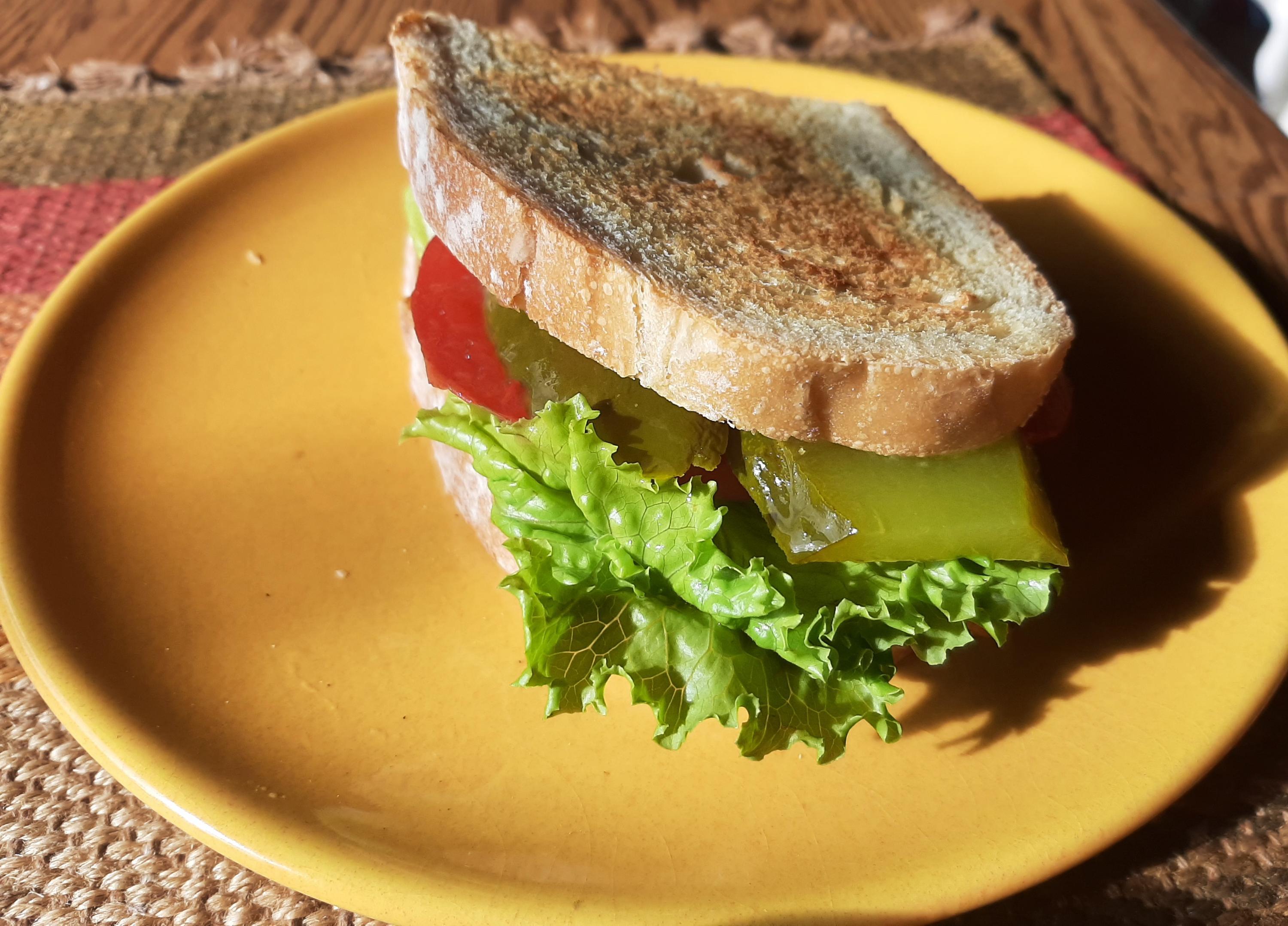 Buried under all this vegetation is a couple of strips of bacon I cooked in the oven a few days ago, for ease of making a favorite sandwich later: Bacon, lettuce, tomato, pickle on toasted sourdough bread. I'm not sure the oven-baking method cooks bacon as satisfactorily, for my tastes, as cooking it atop the stove. Granted, it's less messy. Granted, the bacon is ready to go when I want it, with just a quick reheating if necessary in the microwave. But the bacon out of the oven isn't as crisp as out of the skillet, and the flavor isn't as good. It might be my technique. It might be the brand of bacon. But it might be the method. Time and experimentation will tell. I think I drew different conclusions in earlier tests in the Princessmobile, so it might even be the oven!