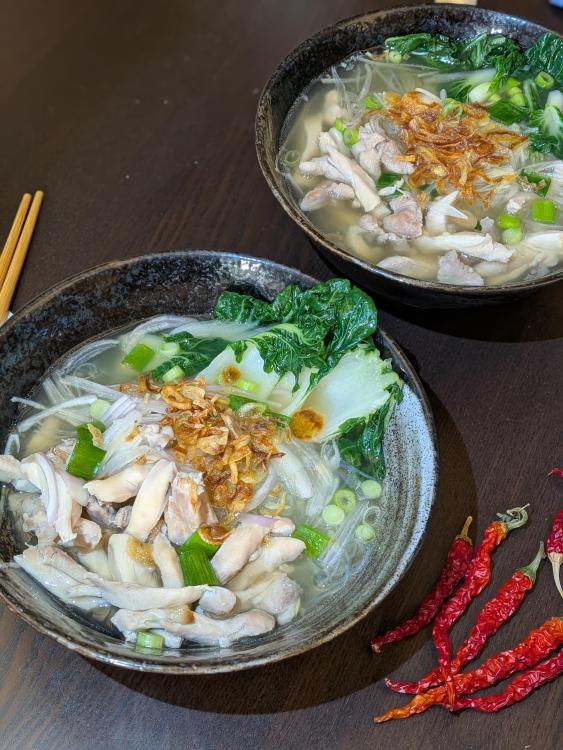Not feeling so well this morning, and considering that I made chicken stock last night, we had Jewish/Vietnamese penicillin.... Mien ga... (Chillies are for decoration - they're drying on the table)