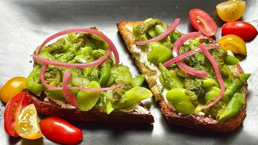 Toasted sourdough, topped with marinated goat cheese, fava beans, asparagus, fresh herbs, a drizzle of green sauce and pickled onions, all from Samin Nosrat’s Good Things