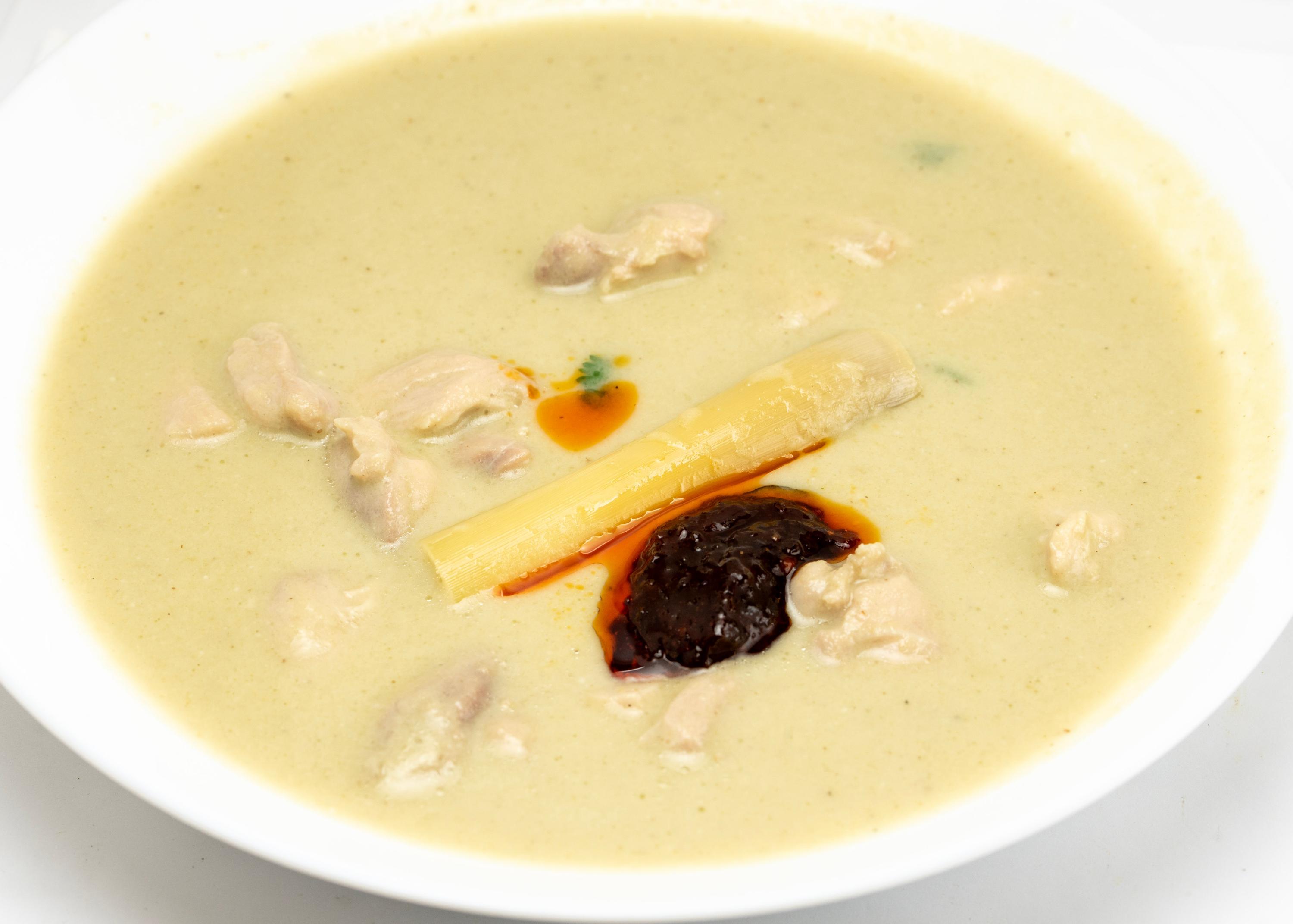 Coconut chicken soup (tomm gai kaa onn): Sequentially simmer coconut milk with 1) a paste of galangal, garlic, cilantro stems, roasted white peppercorns, lemongrass, and shallots; 2) chicken thigh chunks; and 3) bruised lemongrass stalks, lime zest (sub for lime leaves), sliced galangal, sliced Holland chiles, and fish sauce. Finish with lime juice, palm sugar, Thai basil, and cilantro leaves. I made the base soup mild for Mrs. C, and added a dollop of roasted chile paste to mine. Bean sprout salad (yam tua nork): Make a paste of grated and roasted coconut, roasted peanuts, and salt in the mortar. Mix with bean sprouts, sliced shallots, and cilantro leaves, then season with coconut cream and rice vinegar. Will make again.