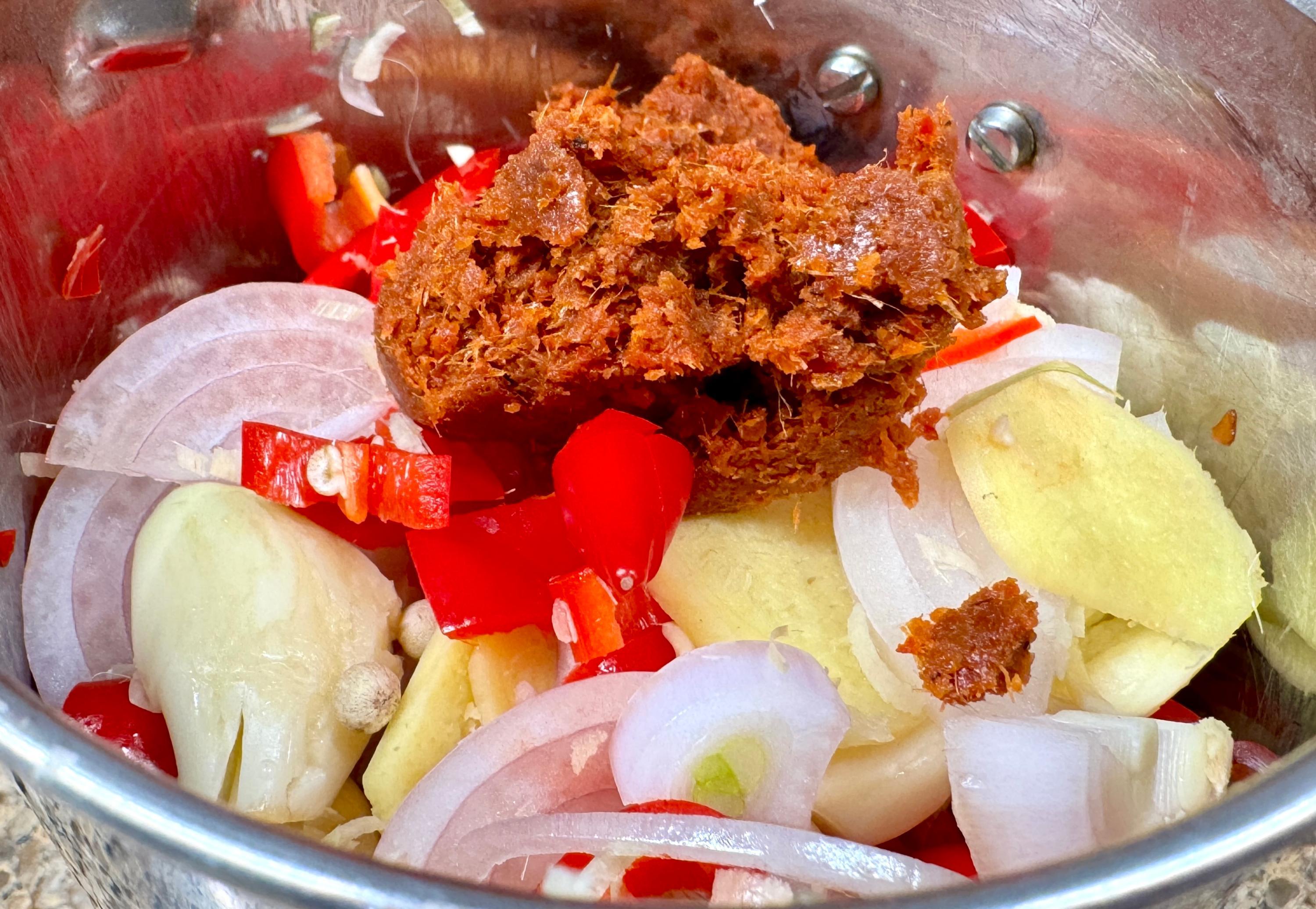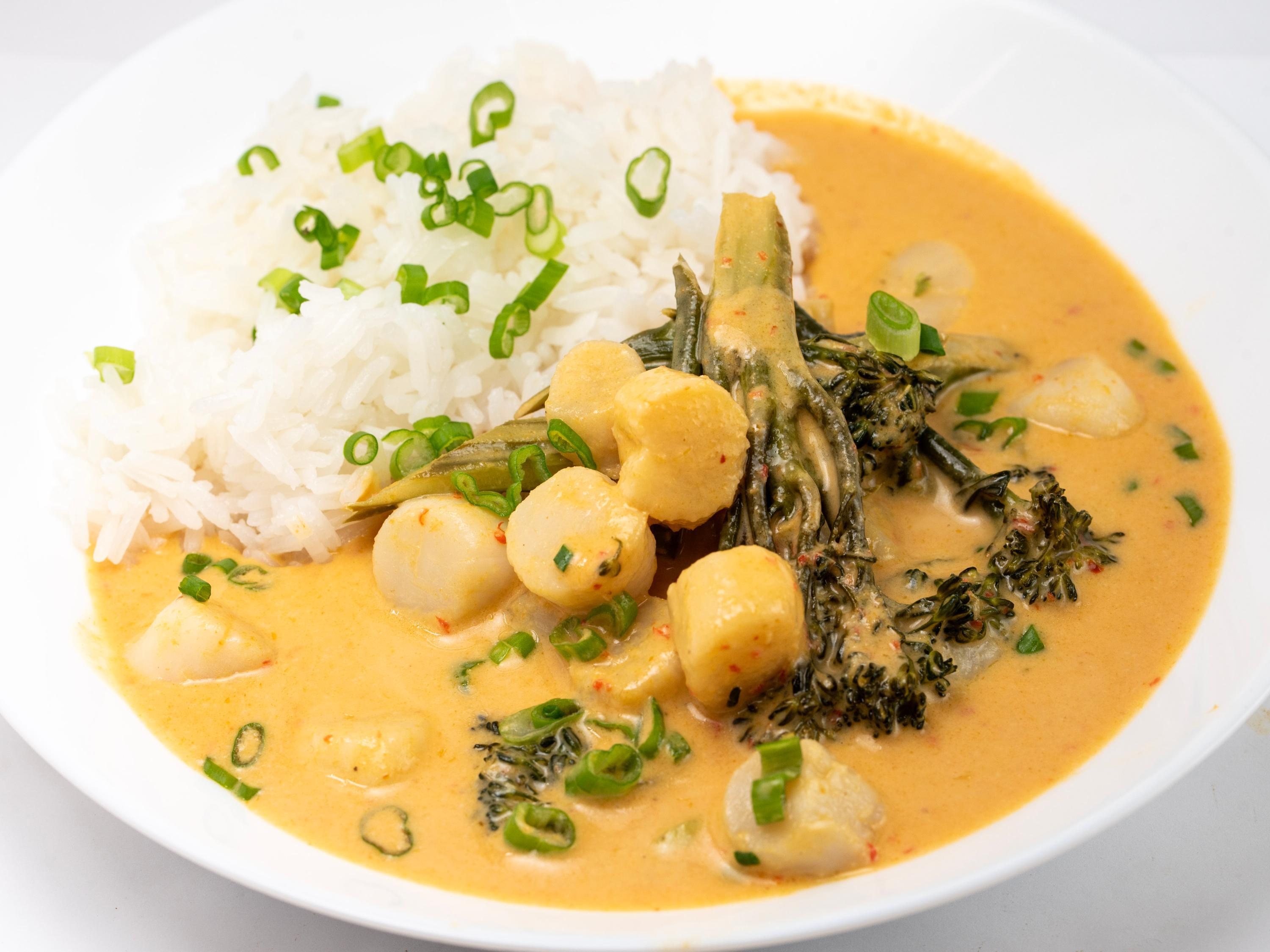 Improvised red curry scallops with broccolini, served with jasmine rice. Tamarind, palm sugar, and fish sauce to balance flavors. For the curry paste, I supplemented pre-made red curry paste with Holland chiles, ginger, shallots, garlic, white peppercorns, and frozen lemongrass and blended everything up in the Preethi.