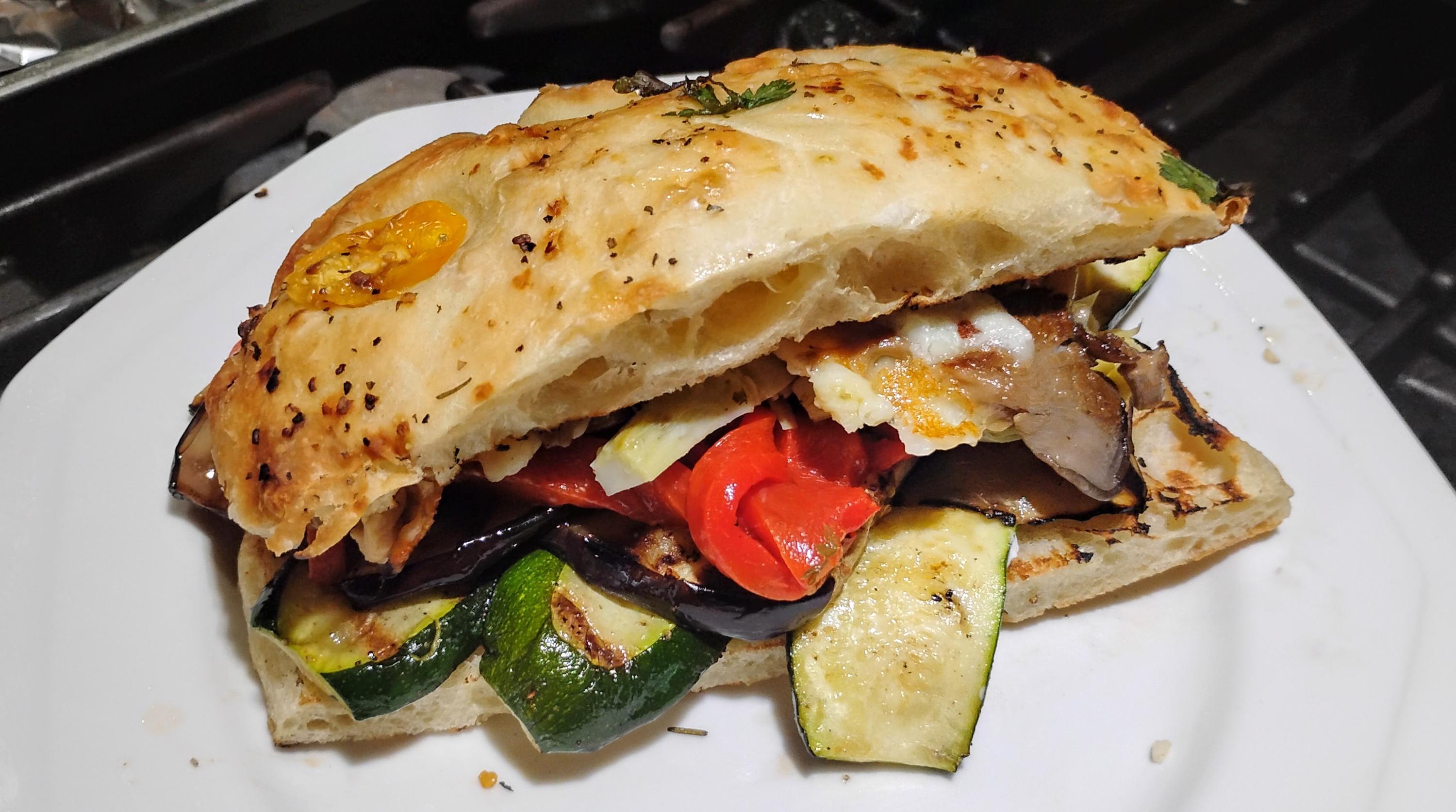 We've had a few meals this week featuring roast peppers. I made a pork and green chili stew with roasted anaheim, poblano and jalapeno peppers earlier in the week that I've enjoyed for breakfast, lunch and dinner. It was a little on the spicy side for my wife and one dinner serving was her limit. I also roasted some meaty red peppers that were combined with grilled vegetables, marinated artichoke hearts, sautéed oyster mushrooms and cotija cheese that was served on toasted focaccia bread from Craft Bakery. The cheese was added to the mushrooms while they were cooking and developed a great crust similar to halloumi.