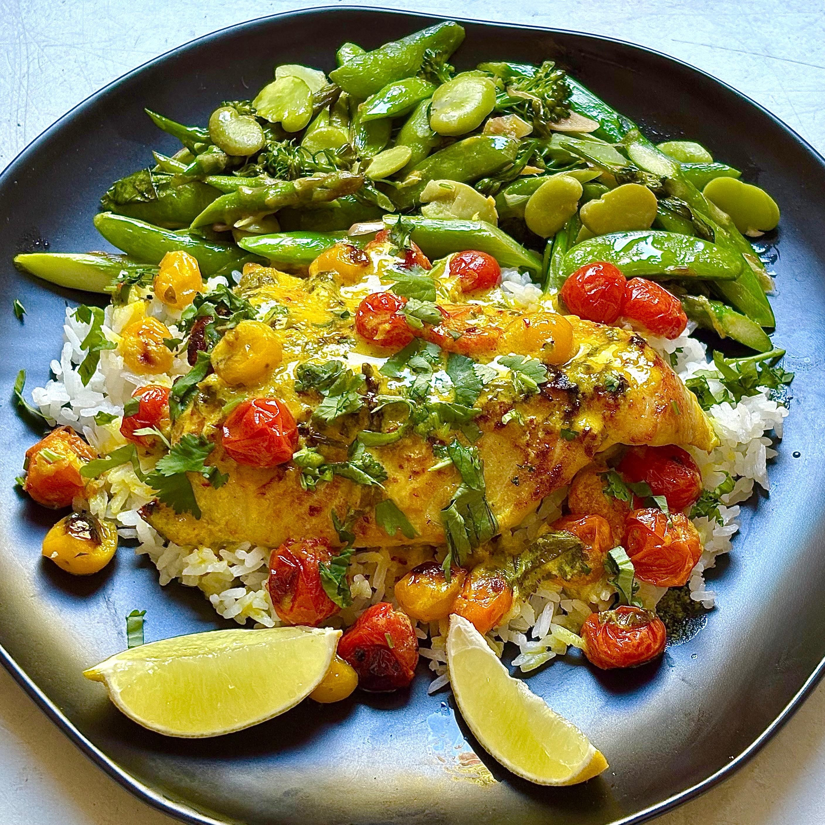 Coconut Fish and Tomato Bake by Yewande Komolafe from New York Times Cooking over rice with a side of Stewed Spring Vegetables (fava beans, asparagus, snap peas and broccolini) from Good Things by Samin Nosrat