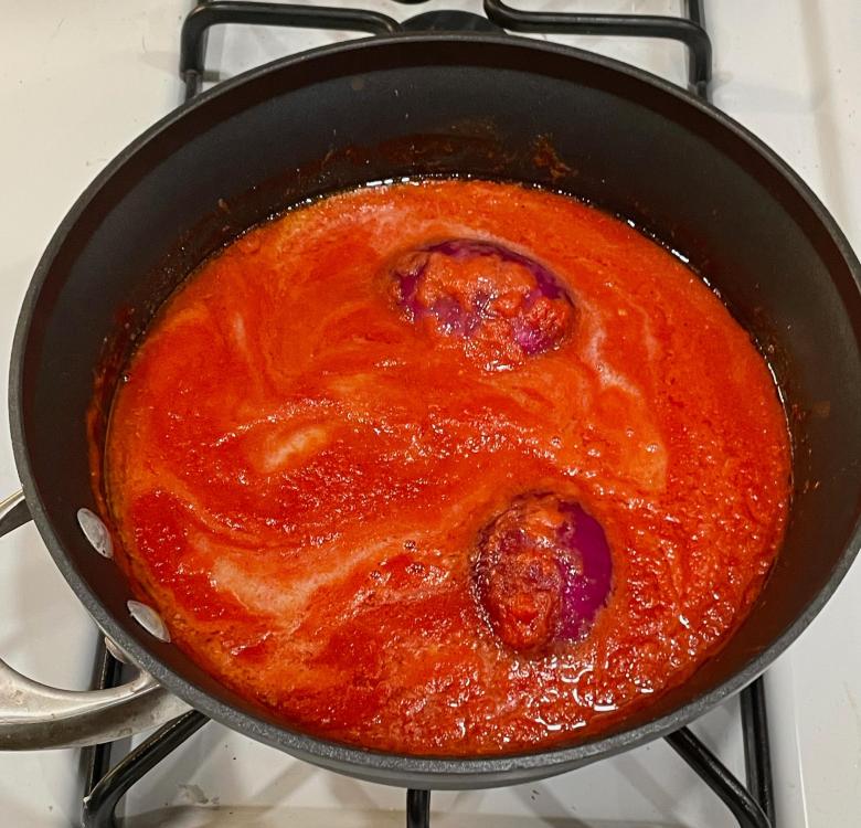 I decided to try some of my precious remaining Asian eggplants in his recipe for Preserved Eggplant. It's an easy recipe: peel the eggplant to the degree you can be bothered; slice; toss with salt; allow to drain; press to drain more; press to drain even more. (His steps are more elaborate, but this is the gist.) Eventually, blot the eggplant and toss with red wine vinegar, then load all into sterilized jars with smashed garlic, enough olive oil to cover, and a sprig of rosemary if you have it. Cap. Stick in the refrigerator. Wait at least a week to try it, but use it all within a month. I worry a little bit about having raw garlic in that anaerobic environment. Sure, there's vinegar. Sure, the garlic was peeled shortly before loading into the jar. Still. Is botulism likely under these circumstances and timelines? I remember having the same misgivings about a recipe from @FoodMan for Stuffed Chiles in Oil. I made the recipe, kept the chiles around, ate some, and eventually threw them away because I was afraid of poisoning myself or my darling. Nobody got sick, and I had been assured that it wouldn't happen, but my internal Food Police took away all the fun.