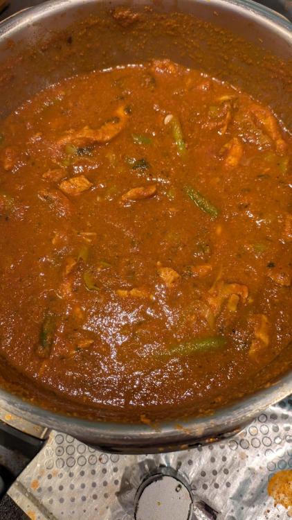 I am probably the crappiest photographer on this forum, but I have cooked and I am sharing. Pressure-cooked curry base (onions-garlic-tomato purree, ground: corriander seed+jeera seed+chilies+couple of fenugreek seeds, kasoori methi leaves+soy sauce, 25 minutes under pressure), chicken breast and frozen green beans added covered (not pressurized) for 15 minutes, squeeze of lemon, ginger matchsticks at the end. Works perfect when you feel like you want Indian food, but Indian is not in your town.