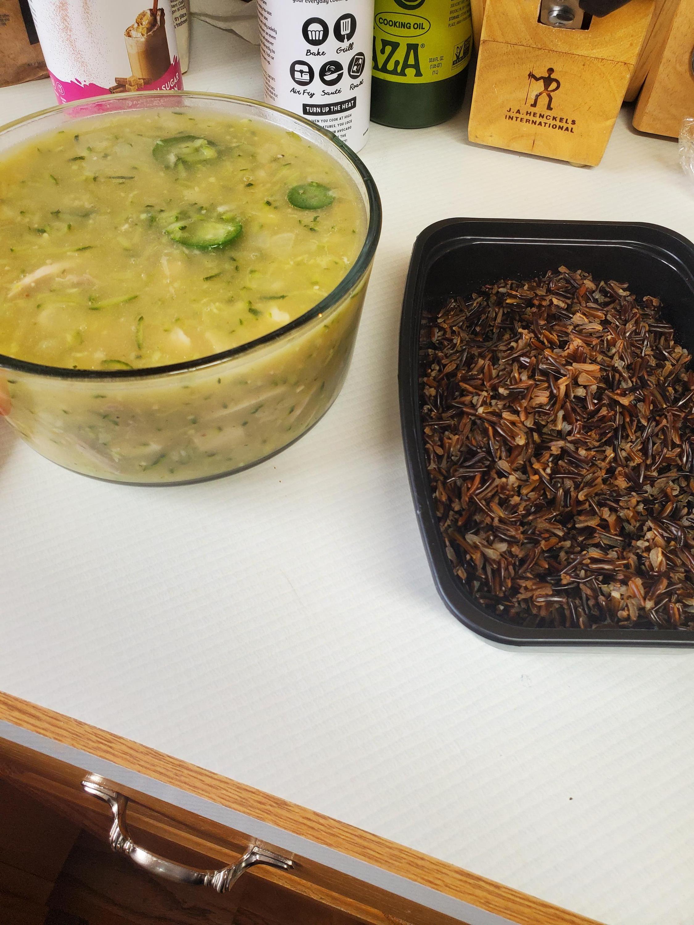 The plague has hit our house so soup it is. For my partner- (wild rice to add when reheated. Also unpictured pasta as an option). Chicken soup with the usual suspects plus shredded zucchini and a jalapeño.