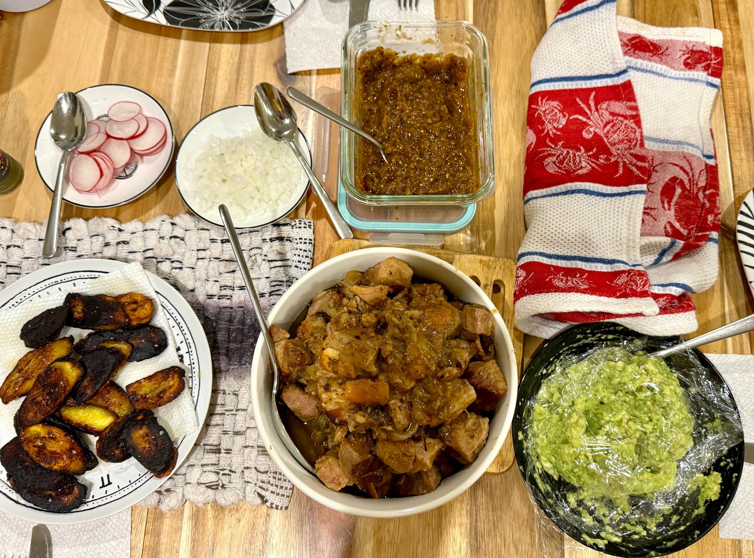 Yesterday: Grilled five-spice chicken with grilled zucchini salad Today: Carnitas tacos! With guacamole (uh, would have looked better if I removed the plastic wrap), sliced radish, minced white onion, house guest's salsa verde, corn tortillas, and fried (burned, sadly) plantains. Carnitas was simmered with white onion, garlic, pickled jalapenos, and Mexican oregano, sauce reduced, and then baked at 450°F with orange peel, orange juice, Coca-Cola, and black pepper.