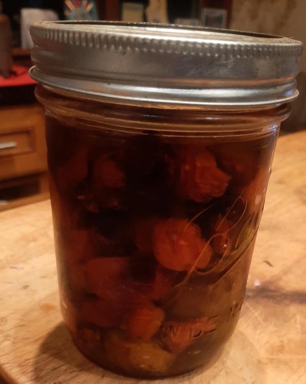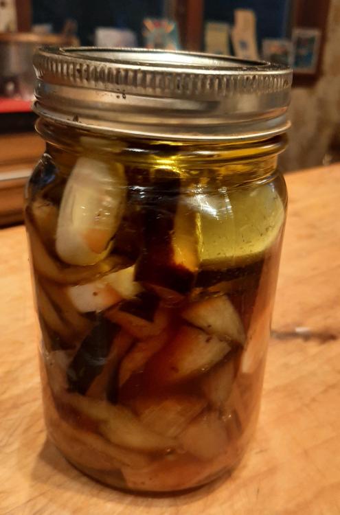 I decided to try some of my precious remaining Asian eggplants in his recipe for Preserved Eggplant. It's an easy recipe: peel the eggplant to the degree you can be bothered; slice; toss with salt; allow to drain; press to drain more; press to drain even more. (His steps are more elaborate, but this is the gist.) Eventually, blot the eggplant and toss with red wine vinegar, then load all into sterilized jars with smashed garlic, enough olive oil to cover, and a sprig of rosemary if you have it. Cap. Stick in the refrigerator. Wait at least a week to try it, but use it all within a month. I worry a little bit about having raw garlic in that anaerobic environment. Sure, there's vinegar. Sure, the garlic was peeled shortly before loading into the jar. Still. Is botulism likely under these circumstances and timelines? I remember having the same misgivings about a recipe from @FoodMan for Stuffed Chiles in Oil. I made the recipe, kept the chiles around, ate some, and eventually threw them away because I was afraid of poisoning myself or my darling. Nobody got sick, and I had been assured that it wouldn't happen, but my internal Food Police took away all the fun.