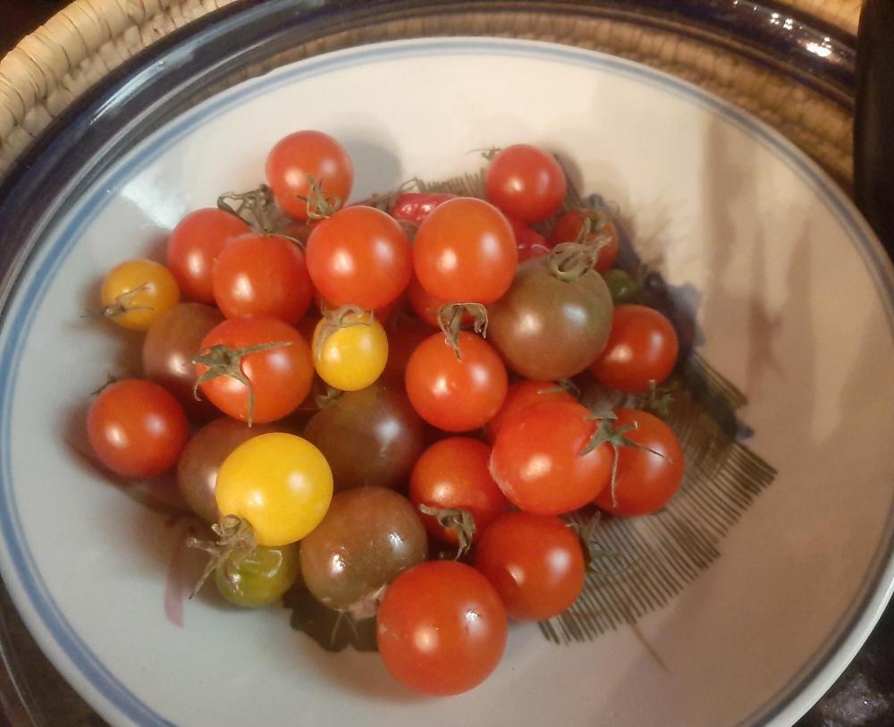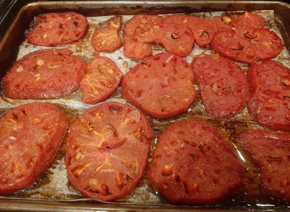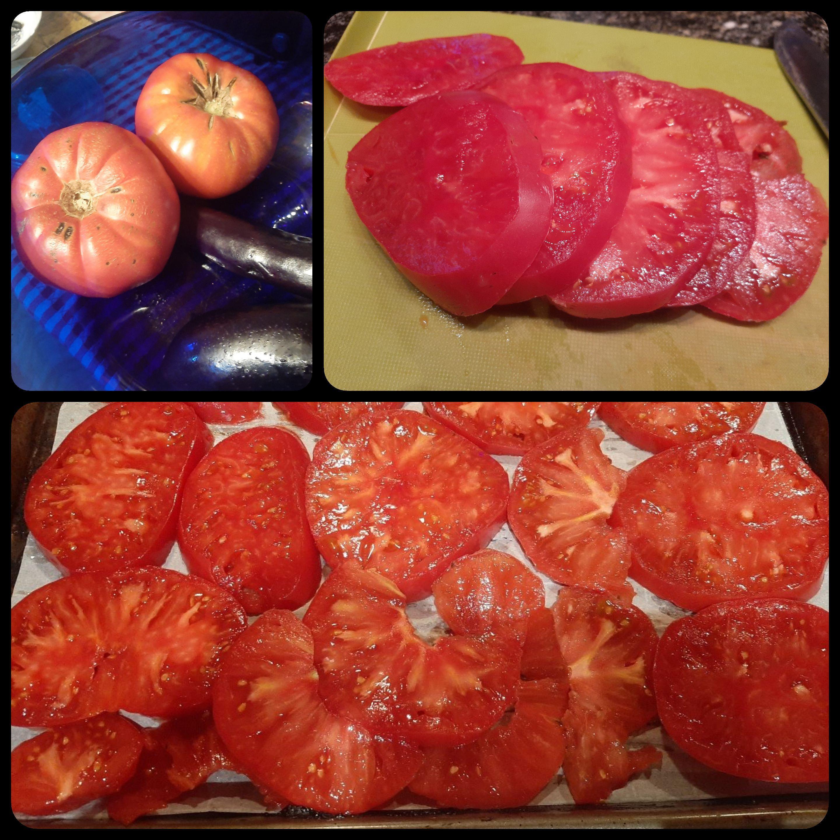 I got my last major haul of tomatoes and eggplants last weekend from my neighboring farmer. Today I faced facts: I wasn't going to get through all those tomatoes or eggplants before they went off. Time to get going on preservation. It just about killed me, though: those beautiful slicer tomatoes! I had too many, and I have some green ones as well waiting for me to fry them, so I had to slice them, roast them, and save them for later. (I kept out two fine-looking slicers, seen in the photo above, for the last-gasp-of-summer sandwiches: BLPT, or simply tomato and cheese. Believe me, I've been eating a lot of those!) The sliced tomatoes got the same treatment I wrote about here: scattered salt, a bit of white pepper, finely sliced shallot, and EVOO, then roasted at around 425 - 450F until a lot of the juices had been cooked out. It will all go into a container and placed in the freezer. It's cooling now. I may not have cooked the slices as much as in past attempts, but I want to see what happens if the slices aren't dried quite so thoroughly. I also bought 3 generous pints of cherry tomatoes from her, and today realized that I can't use them all before they go off. I saved some -- they're wonderful for snacks -- and roasted the rest more or less per @ElainaA's recipe for Slow-Roasted Cherry Tomato Sauce. Finally, most of the Asian eggplants I bought from the same farmer became Preserved Eggplant per a recipe from Joshua McFadden's Six Seasons: A New Way with Vegetables (eG-friendly Amazon.com link). For more discussion about this recipe, see here.