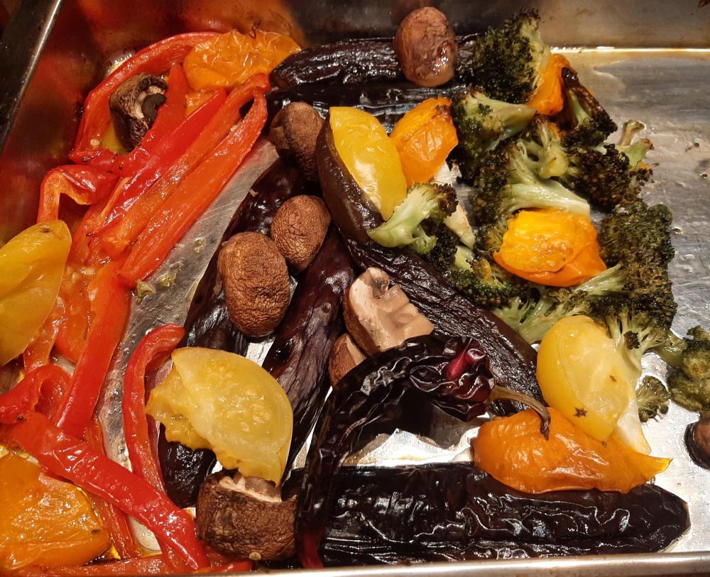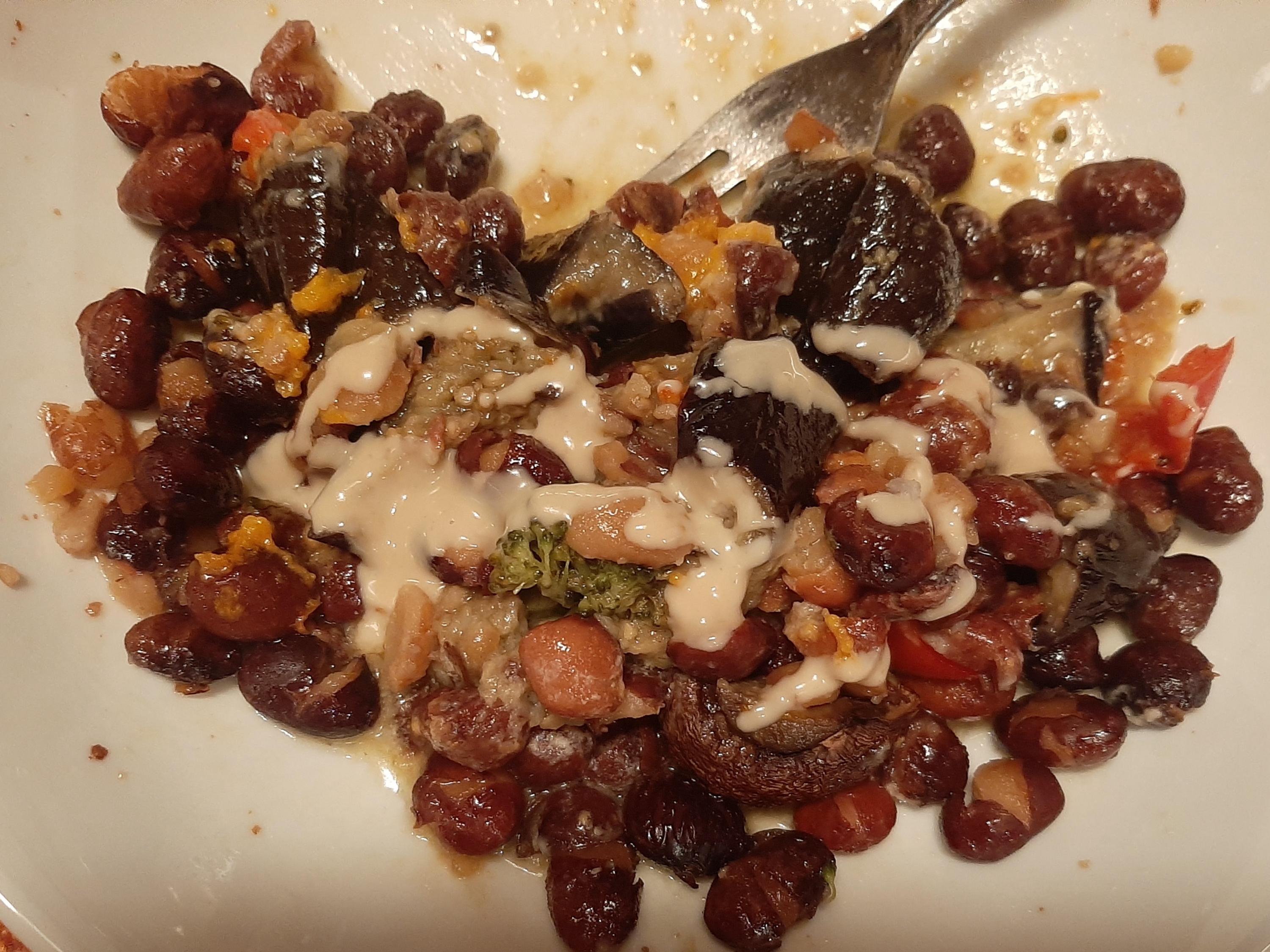 Okay, time for a bit of culinary levity again. Some treasures from the last of the local famrers and their markets have been languishing in my baskets or refrigerators drawers. Tonight I decided that they had to be dealt with: Asian egplants; a red (ripe) bell pepper; a bunch of broccoli; a no-longer green tomato and another not-quite-ripe yellow tomato. I sliced them, tossed them with olive oil and salt, and let the oven do its magic. When I'd decided that it was done enough. I served it over reheated Rancho Gordo Rancho Domingo Bens and added lemon vinaigrette and tahini. It tasted a lot better than it looks, but it's a dinner that will keep on inspiring good dinners.