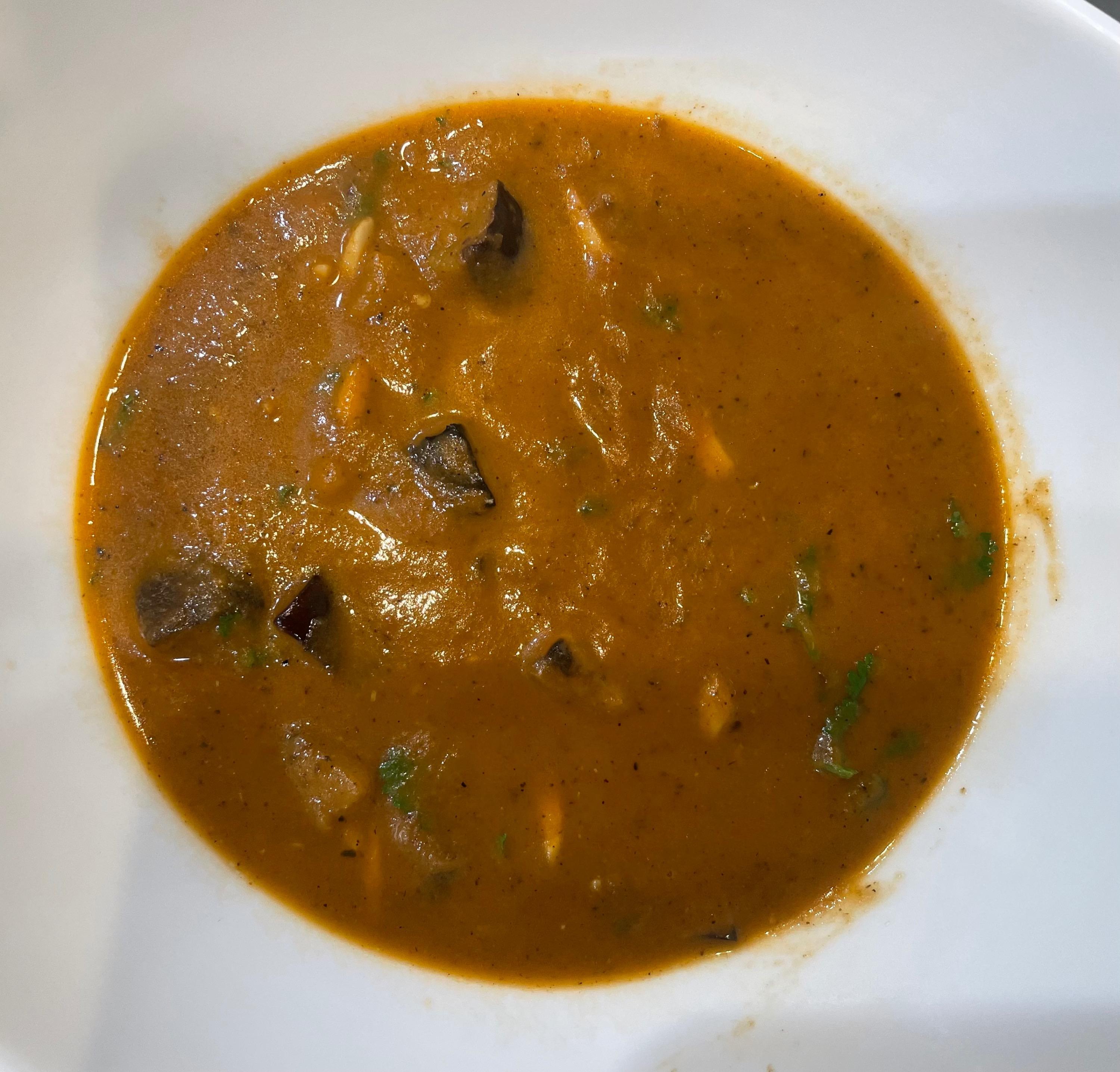 Roasted Eggplant and Tomato Soup - diced eggplant gets roasted under the broiler. Half of the eggplant is cooked with diced tomatoes, red onions, garlic, ras el hanout, cumin, raisins, bay leaves in vegetable broth. After pureeing everything you add the other half of the roasted eggplants and finish with toasted slivered almonds, cilantro and lemon juice