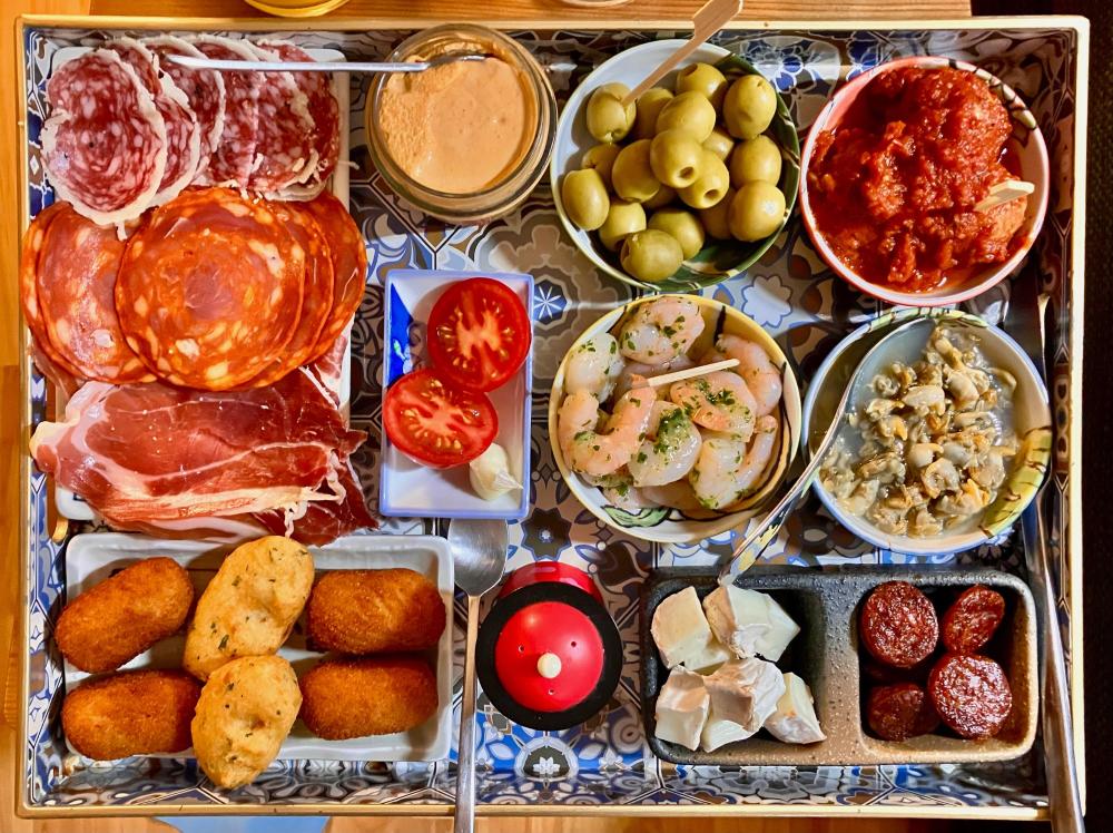 Pica pica (the Catalan version of tapas) … Everything from the fridge/freezer/cans, so just some deep frying and heating up to do: Jamon, chorizo, longaniza with cheese (bread not pictured), croquetes (jamon, chicken, salted cod), salmon pâtè, olives, meatballs in tomato sauce, shrimps with garlic & parsley, berberechos (cockles), goat cheese, fried chorizo. Enjoyed with the classic Blackbeards Ghost and a glass of red … No complaints 🤗