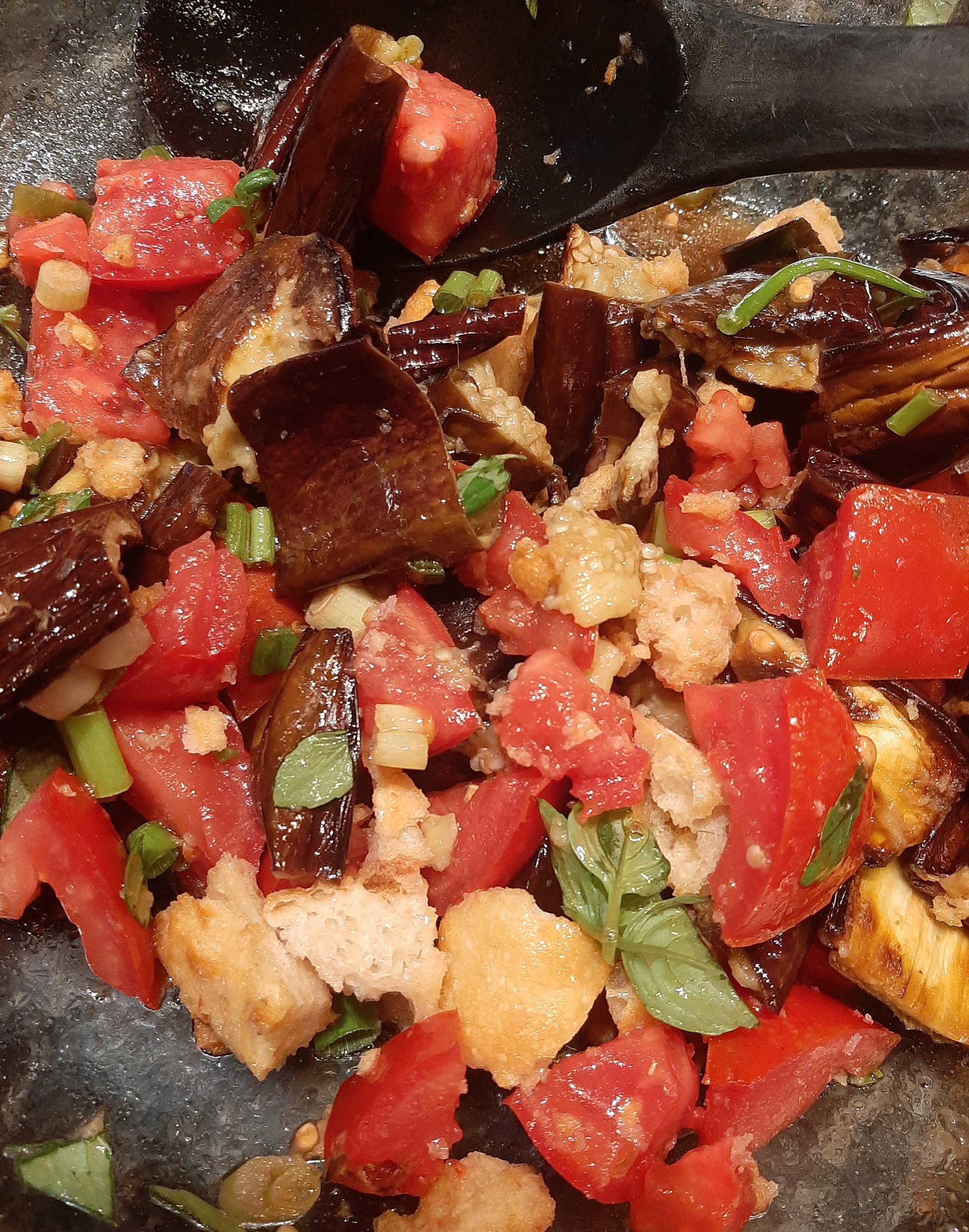 Grilled Eggplant with Tomatoes, Torn Croutons, and Lots of Herbs This doesn't look at all like the photo in the cookbook. A principal reason is that I'm not a food stylist. You're seeing what I plopped into my bowl, rather than the entire platter they show in the book. However, two other reasons are easily spotted: in their photo, the eggplants aren't cut into bite-sized pieces; and I forgot to have a lot of fresh herbs on hand to add! Still, this recipe is a winner even in my inept hands. Today is the first day of truly fall-ish weather up here and I was too cold to grill after an afternoon doing yardwork, so I followed his instructions for oven roasting the eggplant. The instructions worked perfectly. I've asked my local farmer to save me some more of these little eggplants, as well as more tomatoes. This recipe is another keeper.