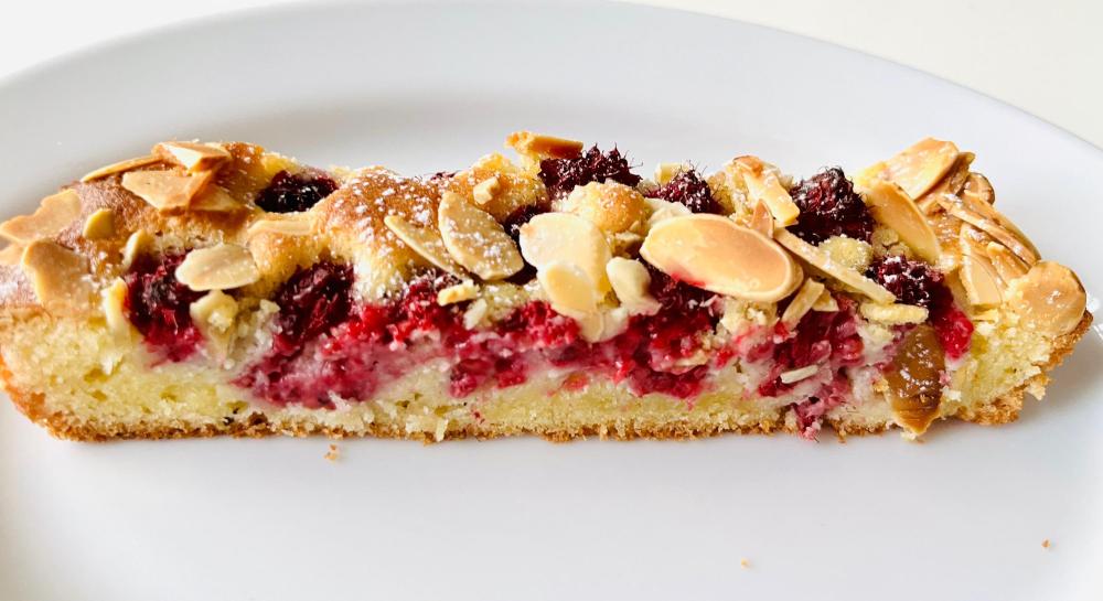 Mortadella, homemade ricotta, pistachio pesto on an olive roll. Raspberry pastry slice, frangipane, almonds.