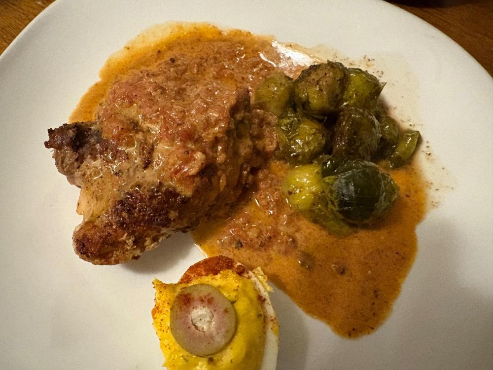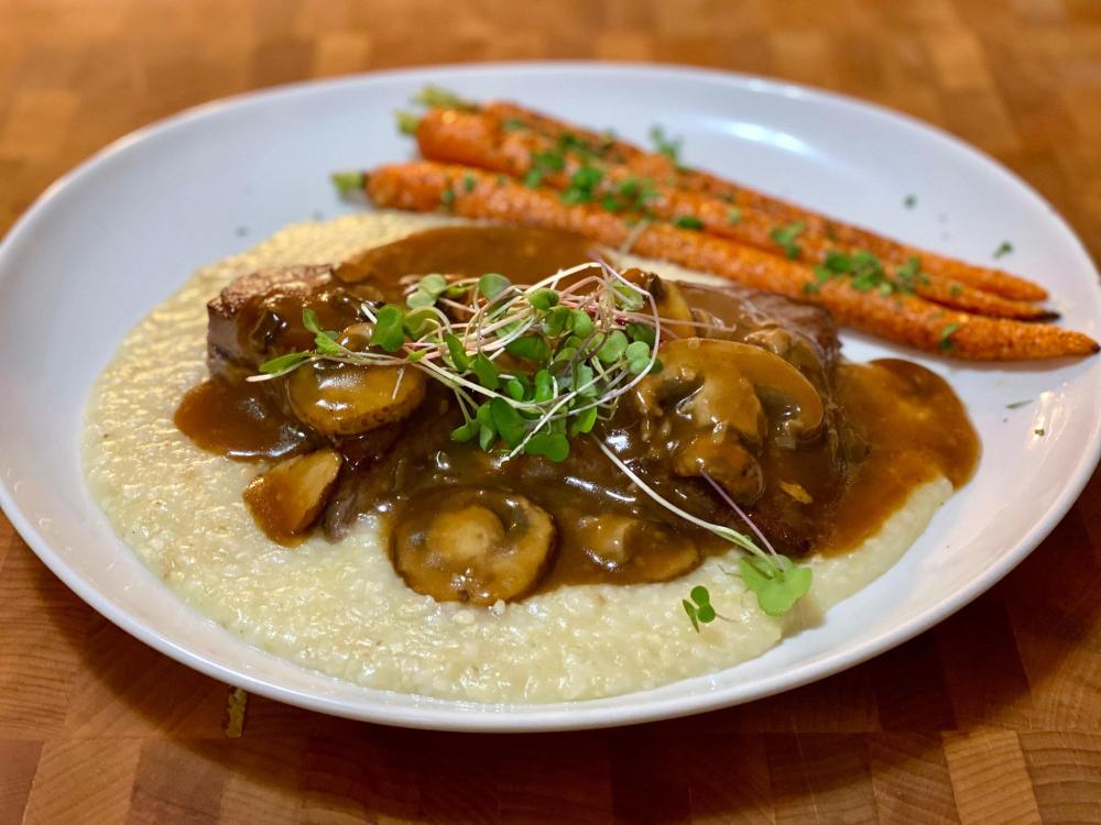 Elk Medallions with mushroom brandy sauce, grits, parmesan, & roasted carrots. Inspired by The Mill in Hershey (PA).