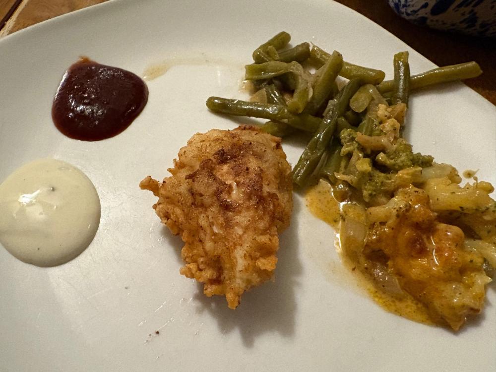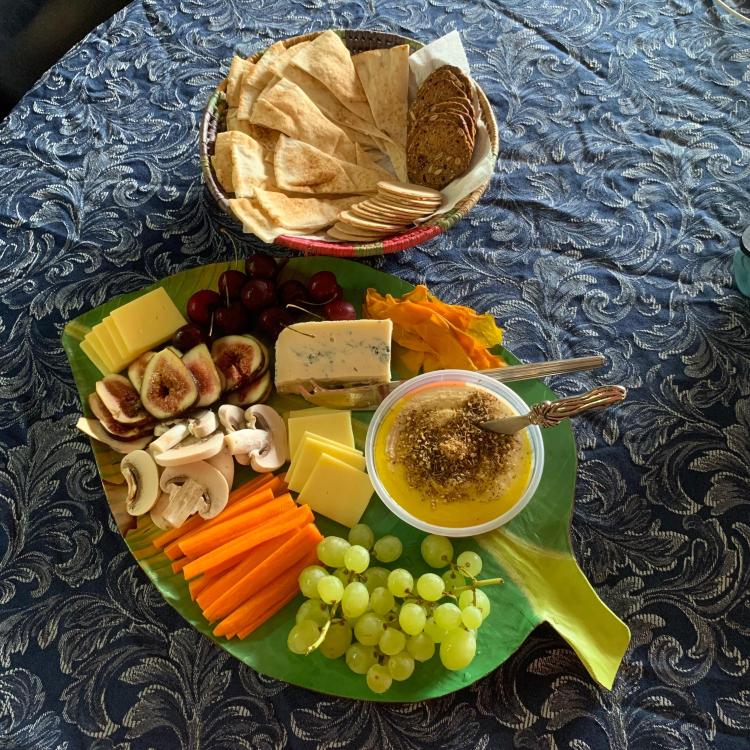 Picnic chicken, baked not fried after the 11 secret herbs and spices 😉 with flat chips and salad. Things in a bowl, chicken on rice, baby pak choy and the last of the bag of bean sprouts. That’s 5 in a row where I’ve managed to use them all before the slime sets in !! I better give up now. Saturday night with the Carolines. Veggies, fruit, dip, cheese, note my dried mango slices from our tree.