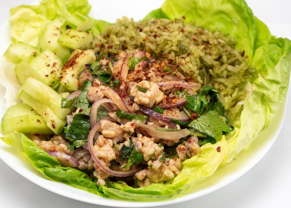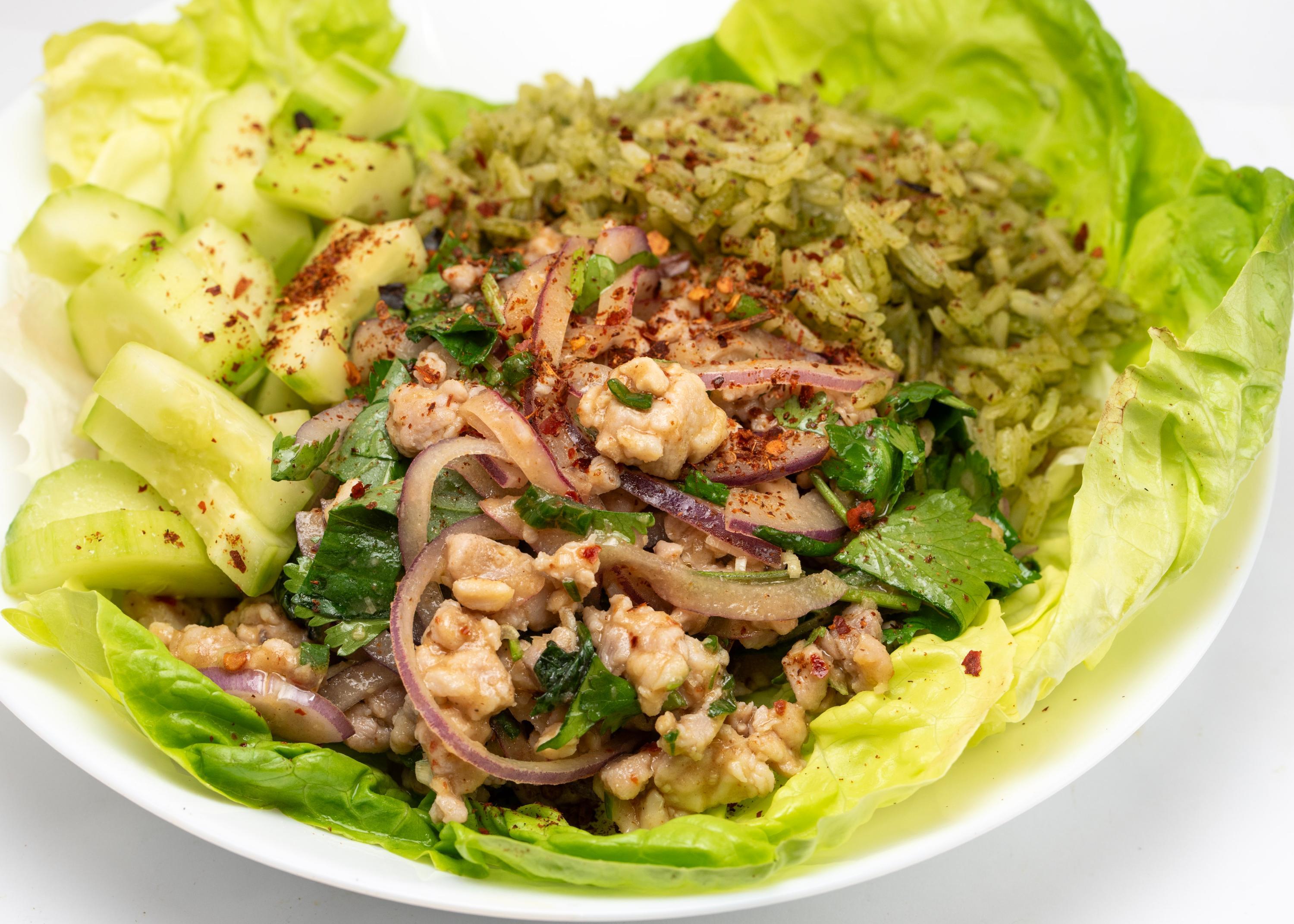 Chicken larb with cucumbers, Boston lettuce, and cilantro-mint rice. Details on Larb laab larp (clicky).