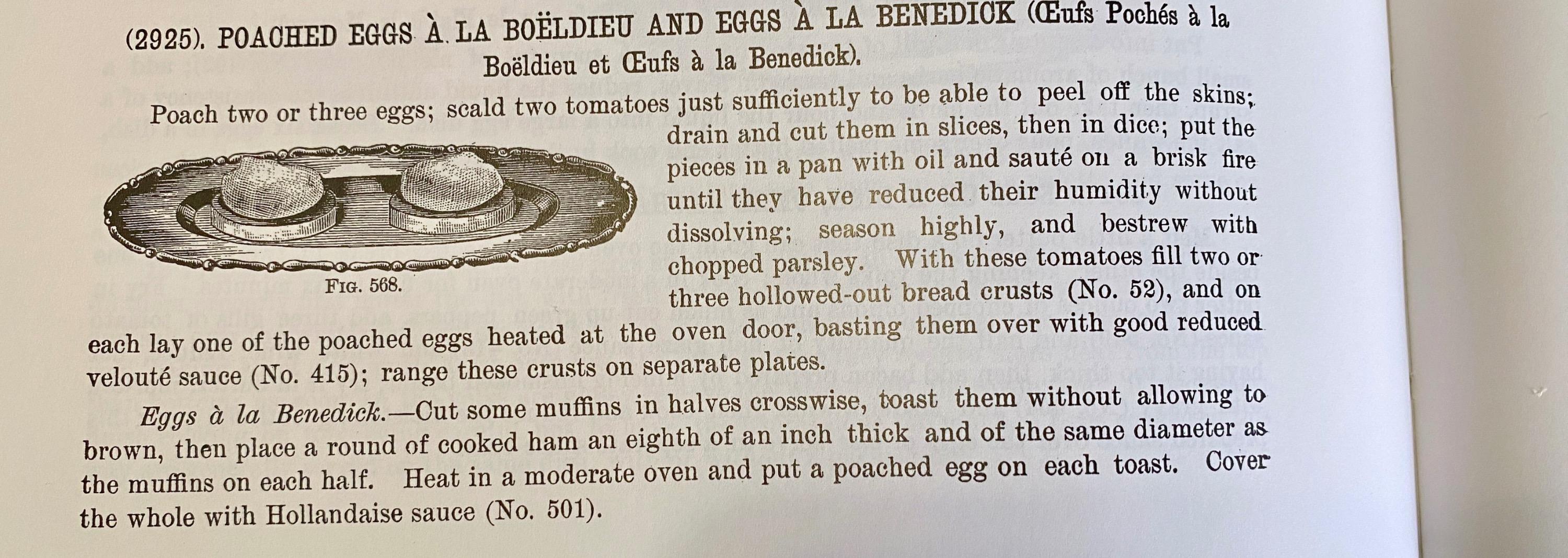 Eggs Royale - English muffin, Scottish smoked salmon, poached eggs, French Hollandaise Sauce, named as such because the butter came from Holland when France couldn't make its own butter during WWI. Like many food origin stories, this one has many unproven rumors that first go back to the original Eggs Benedict, supposedly originally Eggs à la Benedick after Mrs. LeGrand Benedick who wanted something different. Chef Charles Ranhofer of Delmonico's Restaurant in Manhattan created it for her in the 1860s. It is published in his cookbook in 1893. I have the book, and you can see his recipe in the photos. It is also claimed to have been invented at the Waldorf in Manhattan. As for Eggs Royale, I Googled until I reached the end of the internet and have no info on who invented or why it was named as such. My guess was that it was invented for either Scottish, or Norwegian royalty, but I just made that up.