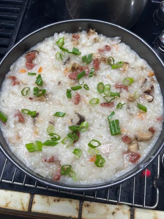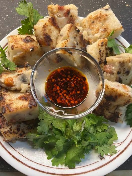 Found a bag of "Southern King Crab claws in the freezer. Not enough for a 2-person meal, and we are too lazy to eat them as claws. Dug out the meat and added to a can of cream of mushroom soup 'cos I am lazy. Eaten with garlic toast. Grocery store had lovely fresh daikon, so I made Lo Bak Goh with rehydrated shrimp and shitaki mushrooms, and lap cheung. Fried some up for lunch!